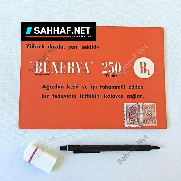 ROCHE BENERVA İLAÇ BROŞÜRÜ Roche ilaç firması BENERVA ilaç tanıtım broşürü. Karton, 1950 veya 60’lar. Üzerinde 2 kuruş belediye ilan pulu ve 1 kuruşluk damga pulu var, 2 kuruşluk belediye il....