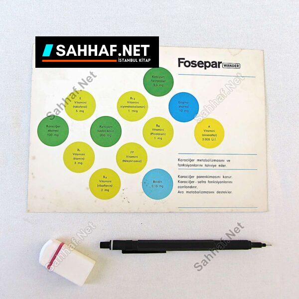 WANDER FOSEPAR İLAÇ BROŞÜRÜ Wander ilaç firması FOSEPAR ilaç tanıtım broşürü. Postadan geçmiş, üzerinde 10 kuruş posta pulu ve 1 kuruşmatbu damga var.Karton, 1950 veya 60’lar. Kondisyon: Çok....