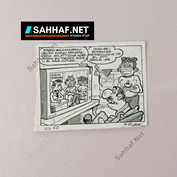 ORİJİNAL KARİKATÜR Bugün balkanlardan gelen komşu arkadaşların anlattığına göre ordan bu tarafa yağışlı bi hava kütlesi… Karton üzerine çini mürekkebi, dergide yayınlanmış, el çizimi orijina....