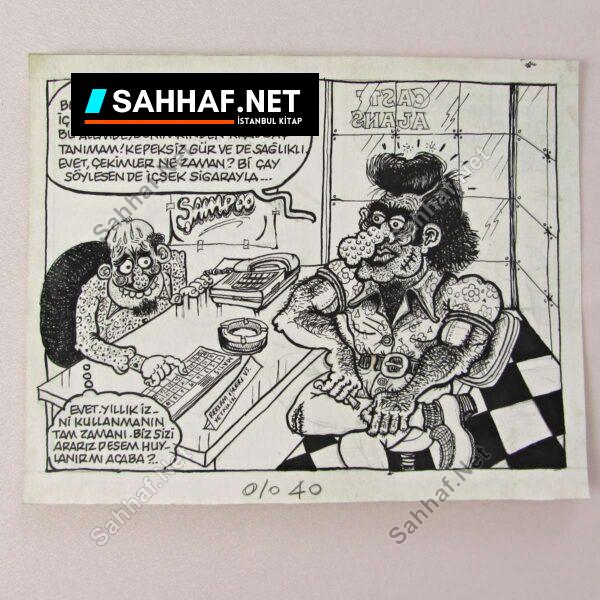 ORİJİNAL KARİKATÜR Manyak bu hoca ya… Her gün birimizi kesiyo… Karton üzerine çini mürekkebi, dergide yayınlanmış, el çizimi orijinal karikatür. 1980 sonları veya 1990 başları. (Belirt....