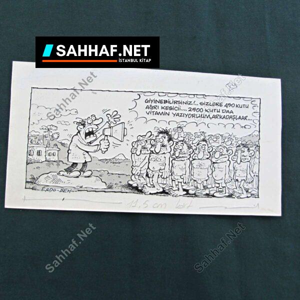 ORİJİNAL KARİKATÜR Giyinebilirsiniz!.. Sizlere 450 kutu ağrı kesicii… 2500 kutu daa vitamin yazıyoruum arkadaşlaar… Karton üzerine çini mürekkebi, dergide yayınlanmış, el çizimi orijin....