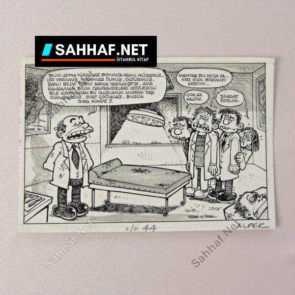 ORİJİNAL KARİKATÜR Manyak bu hoca ya… Her gün birimizi kesiyo… Karton üzerine çini mürekkebi, dergide yayınlanmış, el çizimi orijinal karikatür. 1980 sonları veya 1990 başları. (Belirt....