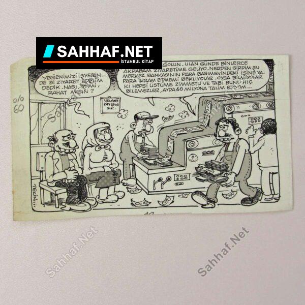ORİJİNAL KARİKATÜR Giyinebilirsiniz!.. Sizlere 450 kutu ağrı kesicii… 2500 kutu daa vitamin yazıyoruum arkadaşlaar… Karton üzerine çini mürekkebi, dergide yayınlanmış, el çizimi orijin....