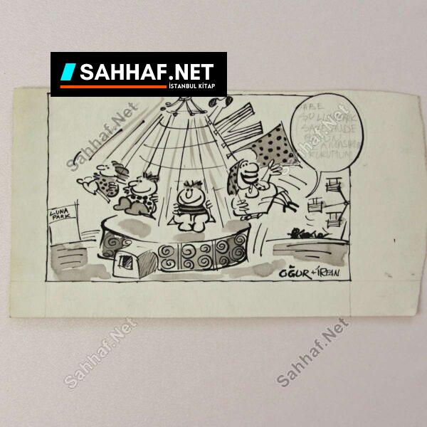 ORİJİNAL KARİKATÜR Oh be! Şu lunapark sayesinde bütün çamaşırları kuruttum. Konuşma yazısı kurşunkalemle yazılmış. Karton üzerine çini mürekkebi, dergide yayınlanmış, el çizimi orijinal karikatür.....