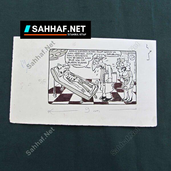 ORİJİNAL KARİKATÜR Adam kansızlıktan ölüp gidiyo. Ya kan vericez ama grubunu tahlil etmemiz için bi gram kanı bile yok. Tıp burda susar. Yazıık… Karton üzerine çini mürekkebi, dergide yayınl....