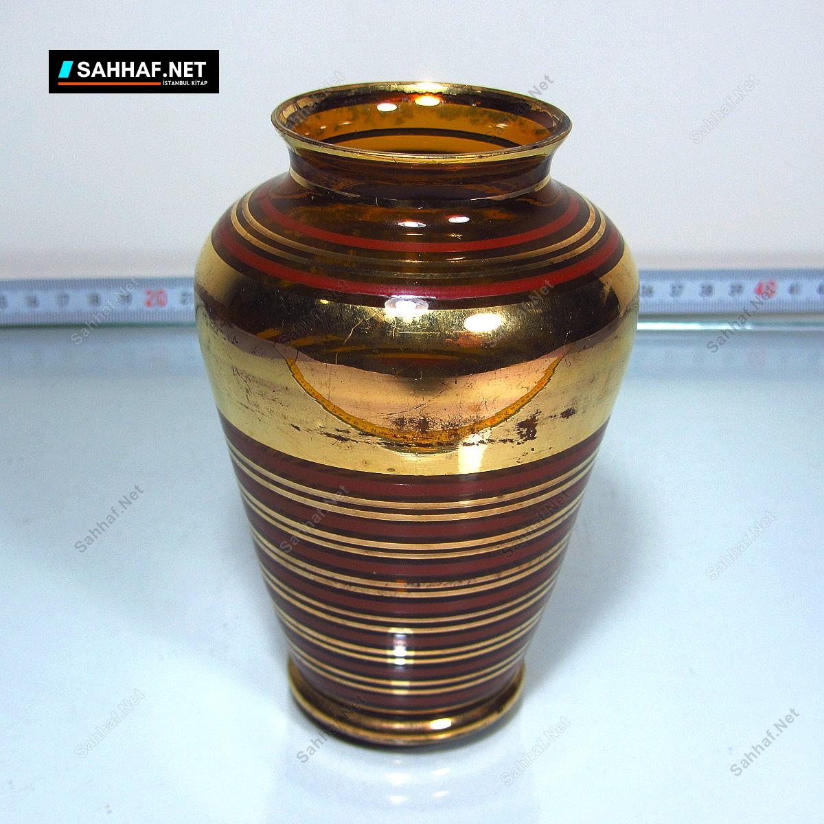 1960’lı yıllardan kırmızı renkte cam vazo. Üzerinde altın yaldız şeritler var. Yükseklik: 12 cm