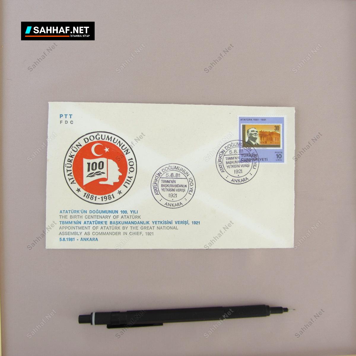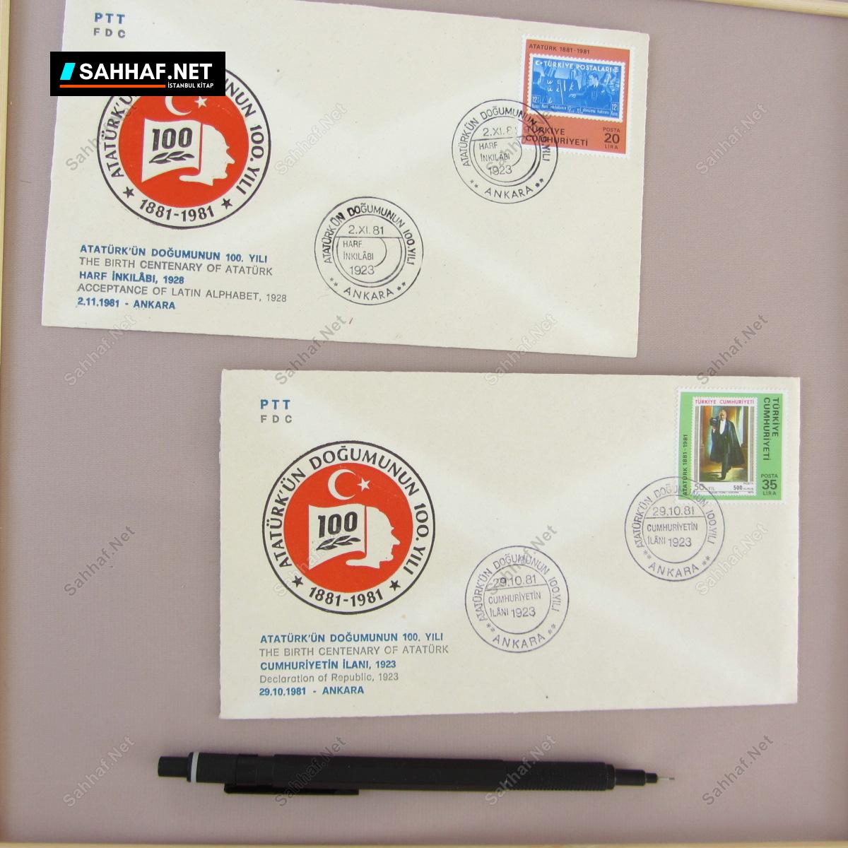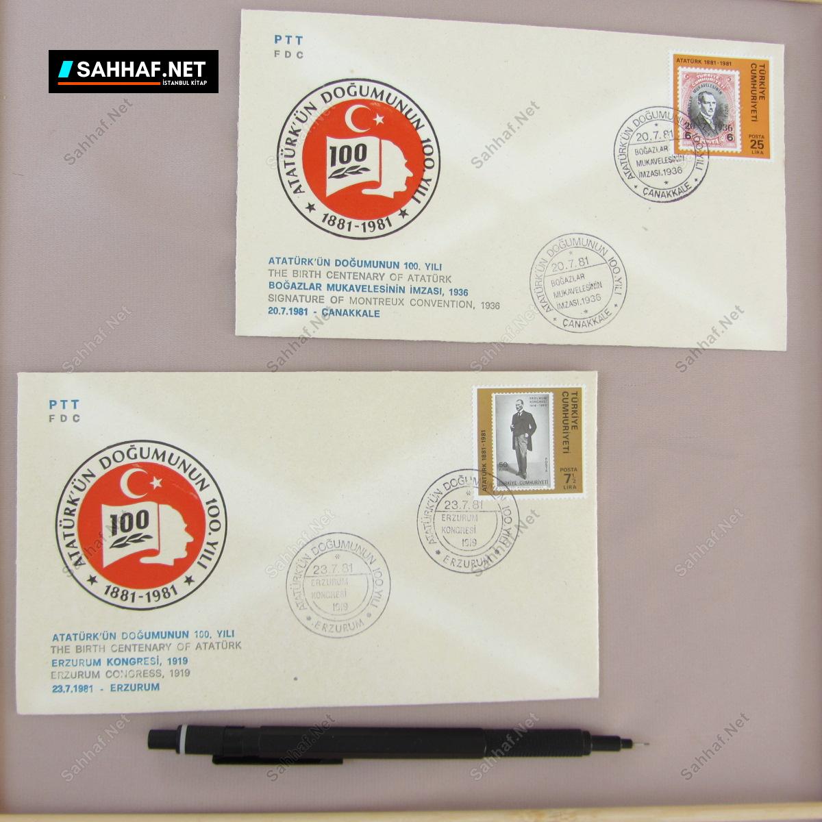 Atatürk’ün doğumunun 100. yılı anısına yapılan 5 farklı mektup zarfı. 1881-1981 yılı 100.yıl zarfları sırasıyla şöyle: Cumhuriyetin İlanı 1923, Harf İnkılabı 1928, TBMM’nin Atatürk’e Başkumandanlık Yetkisini Verişi 1921, Boğazlar Mukavelesinin imzası 1936, Erzurum Kongresi 1919.