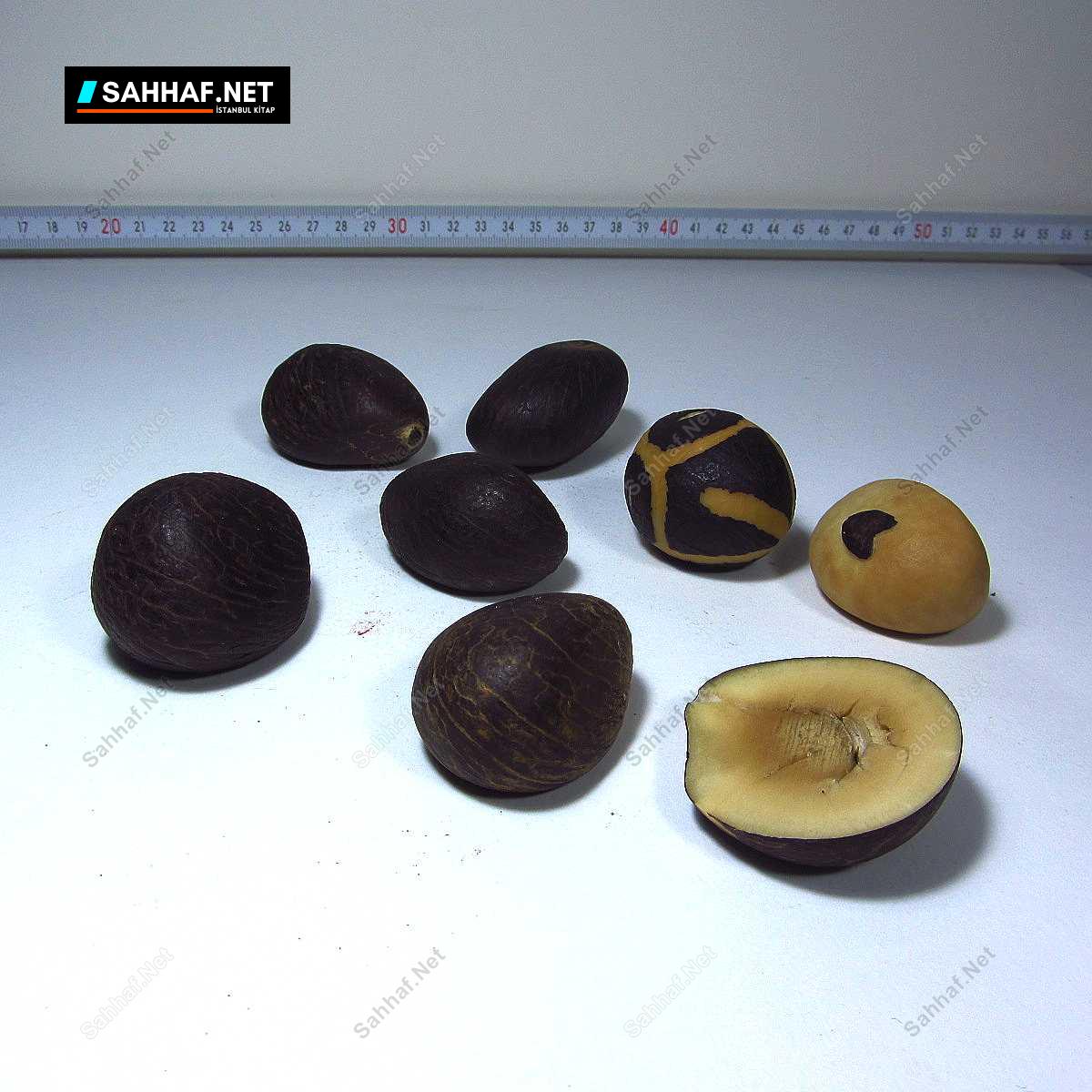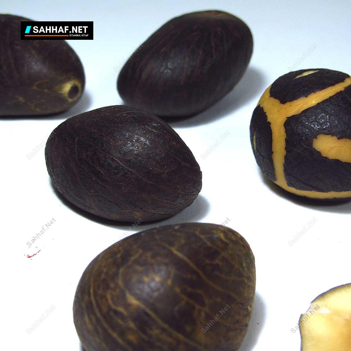 Kukaya benziyor fakat kuka değil, emin değilim fakat tesbihçilikte kullanılan bir ağaç tohumu, oldukça sert ve pürüzsüz bir yapısı var; bunlar tabii ham halde, işlenmemiş fakat 1 tanesine desen verilmiş, bir tanesinin koyu renkli kabuğu soyularak kalp işlenmiş, bir tanesine desen verilmiş, bir tanesi de içini göstermesi adına ortadan kesilmiş (tek parça). Tane boyları 4 cm civarında. Tesbih yapılabilir, anahtarlık yapılabilir, dekor yapılabilir; estetik şeyler.