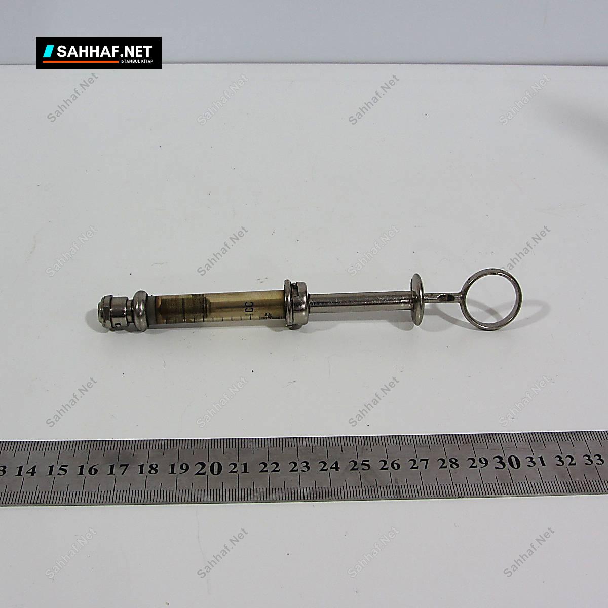 Bilindik cam enjektörlerden farklı bir enjektör. Belki baytarların kullandığı belki de farklı amaçlar için kullanılan bir örnek olabilir. Koleksiyonluk.