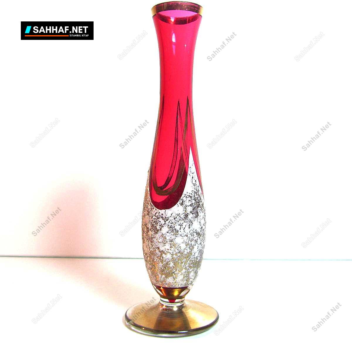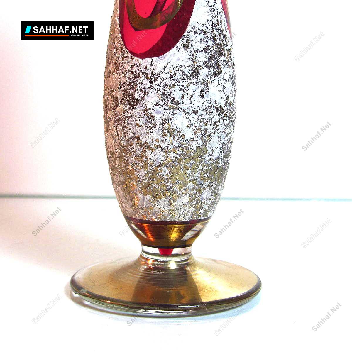 Çok güzel kırmızı renkte bir cam karanfillik. Alt kısmı opak beyaz ve altın rengiyle desenlenmiş. En altta kaide kısmında altinde hafif renk solması ve 2 mm atık var fakat kaide kısmında. Ele alıp incelemedikçe belli olacak bir şekilde değil. Yükseklik: 21 cm