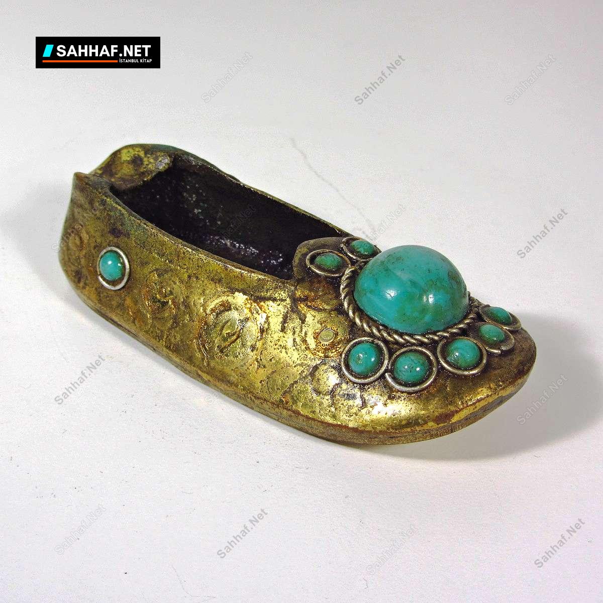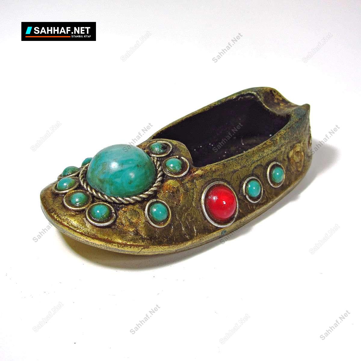 Çarık şeklinde mini kül tabağı. Üzerinde firuze renginde plastik süslemeler var, bir kısmı dökülmüş, bu tarz yapıştırma süslemeler uzun ömürlü olmyor, bir de zamanın yıpratıcı etkisi eklenince kendi kendine dökülür gider. Boy: 10 cm
