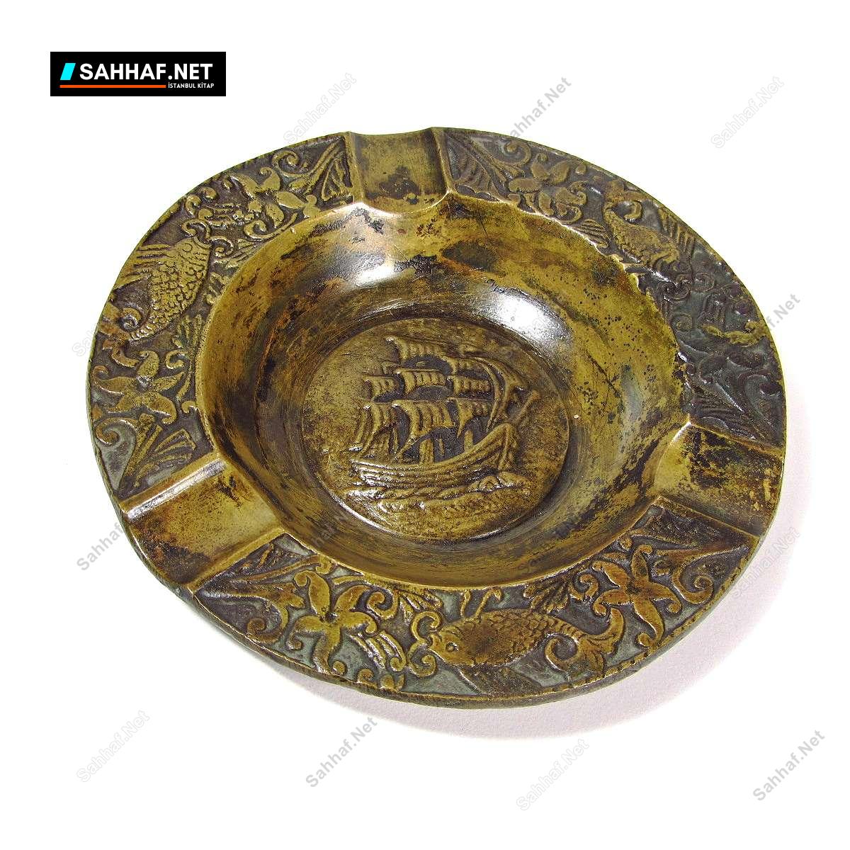 Denizcilik temalı pirinç kül tabağı. Ortasında yelkenli bir gem ve etrafında balık ve çiçek kabartmaları var. Bir kenarında 1 mm kadar çok hafif bir esneme var, rahatlıkla düzeltilebilir. Çap: 11 cm