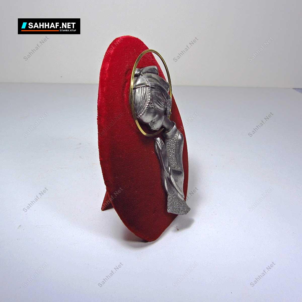 Son derece şık vitrin dekoru, dua eden bir kız figürü, dökme kurşun malzemeden yapılmıştır, arka fonda kırmızı kadife kullanılmış, arkasında katlanabilir bir standı mevcut, onunla kendi başına ayakta durabiliyor. Tek kelimeyle nefis bir obje ve Avrupa ürünüdür. Yükseklik: 11 cm