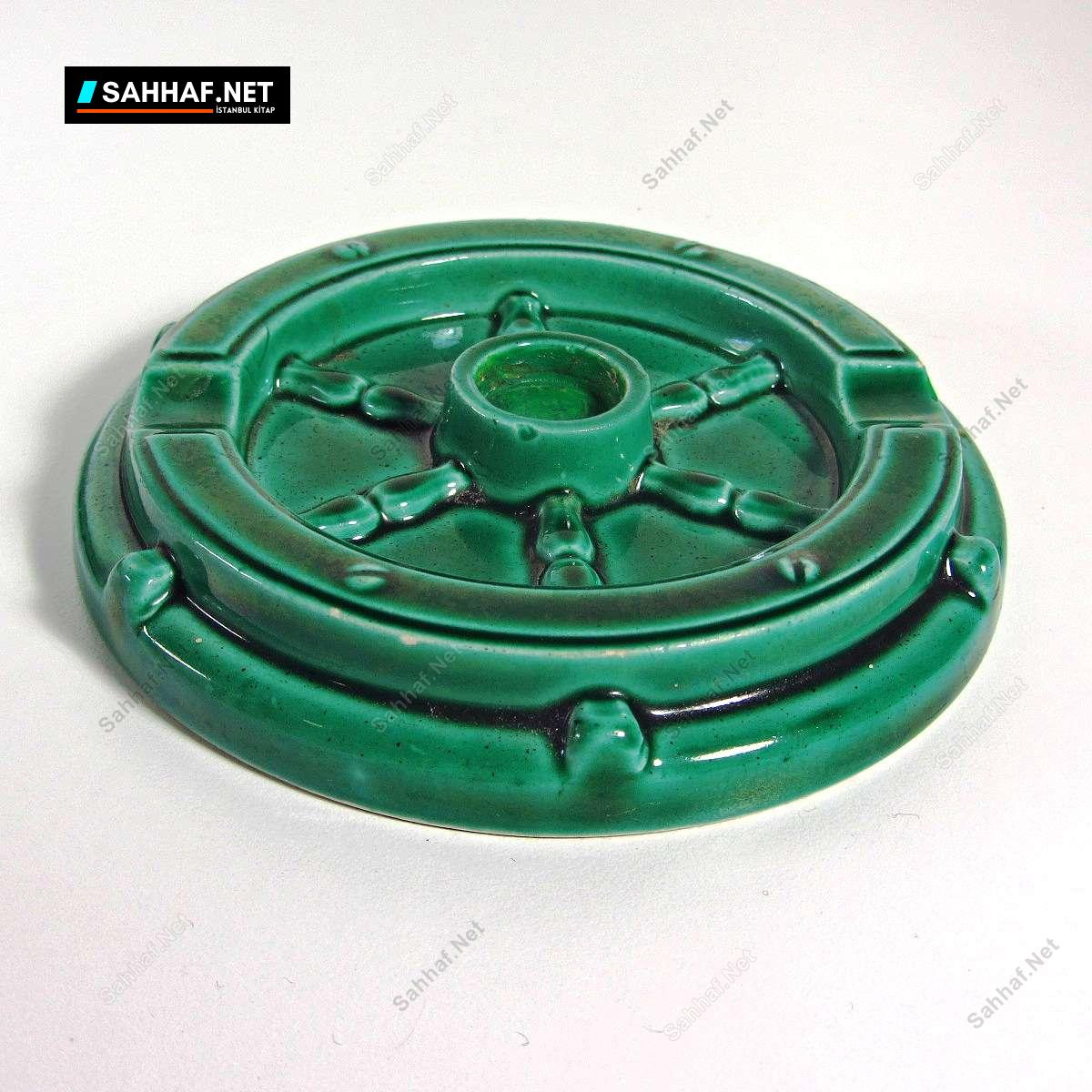 Gemi dümeni figürü taşıyan denizcilik temalı bir seramik küllük. Orta göbeği mum konabilecek şekilde yapılmış. Şamdan olarak da kullanılabilir. Hoş bir yeşil rengi var. Çap: 11,5 cm