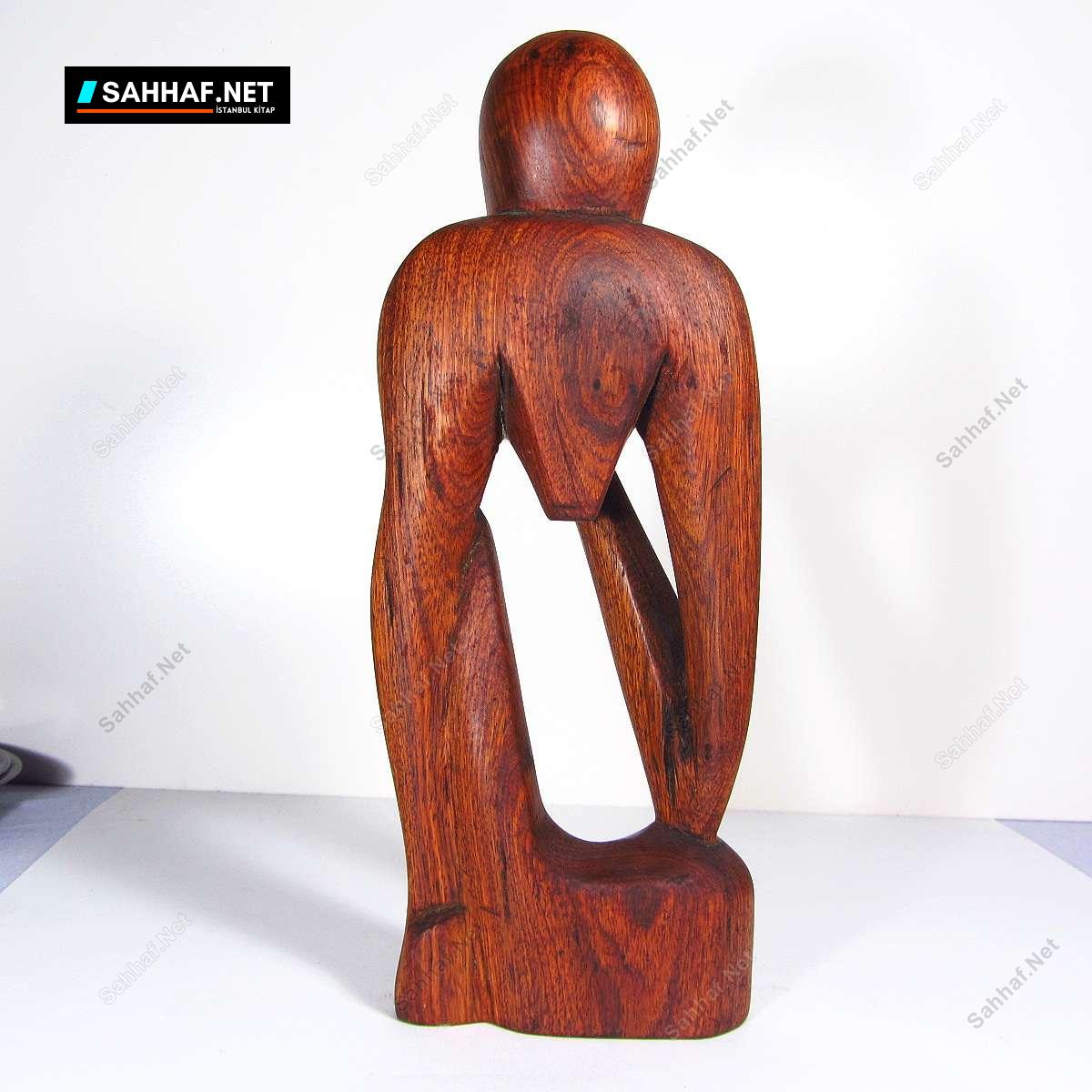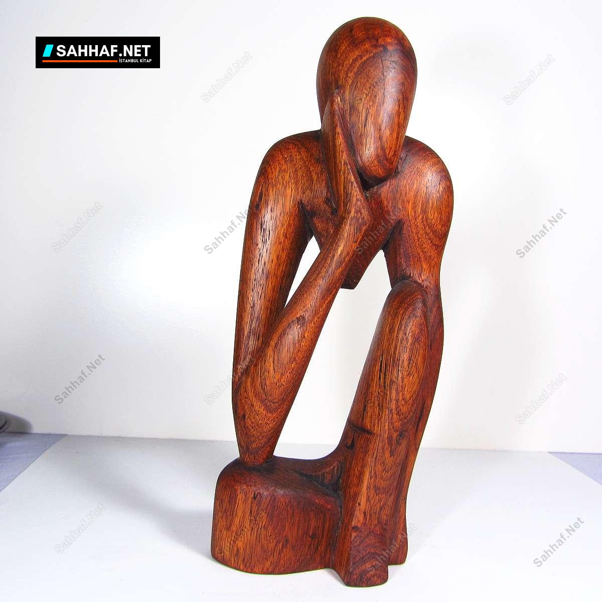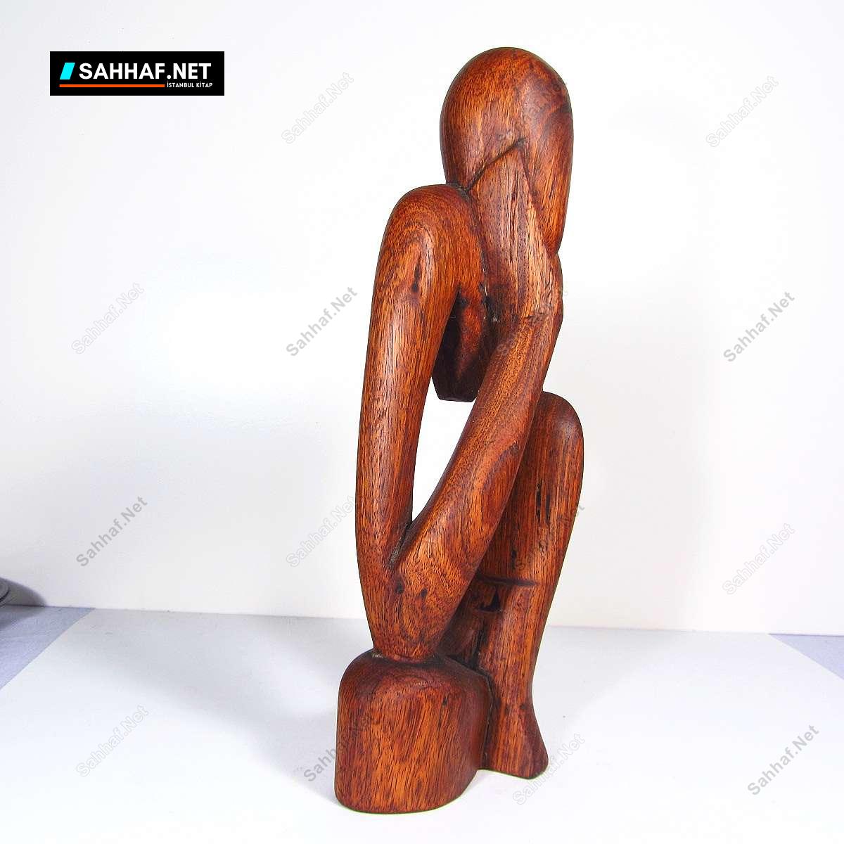 Soyut bir çalışma, ahşap malzemeden düşünen adam heykeli. Özenli bir çalışma, ve güzel bir kompozisyon. Kullanılan ağaç da güzel bir ağaç, muhtemelen sanatçı elinden çıkmış, basit bir çalışma değil. Kaliteli bir dekor objesi, tek parça ahşaptır. Yükseklik: 33 cm