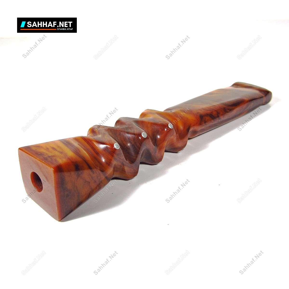 Sıradışı bir ağızlık. Ağız kısmına doğru kıvrımlı bir form verilmiş, geniş; yayvan bir yapıya sahip kıvrımların her bir köşesine metal (muhtemelen gümüş) çiviler çakılmış ilginç bir tasarımı var. Eski bir malzeme, akrilik, katalin gibi; çok zengin bir duruşu var. Zamanının kalantor işi muhtemelen. Boy: 14,5 cm