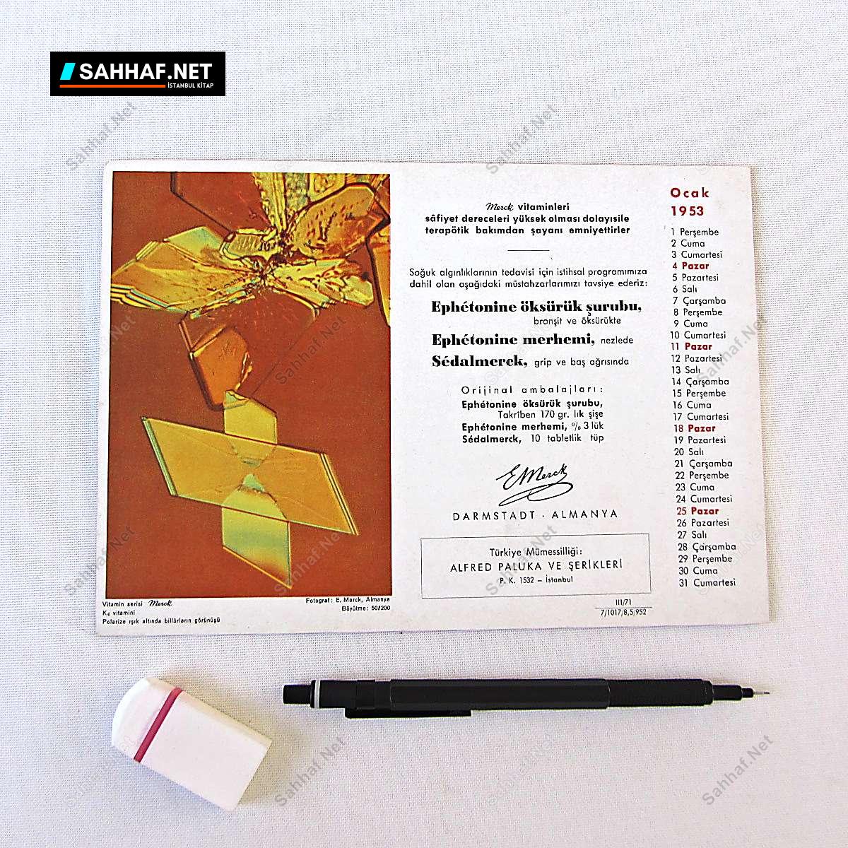 EMerck ilaç firması EPHETONINE ve SEDALMEREK ilaç tanıtım broşürü. Karton, 1950’ler. Üzerinde 1953 yılınıın takvimi var.