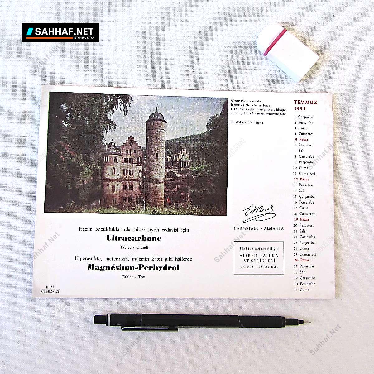 EMerck ilaç firması ULTRACARBONE ve MAGNESIUM-PERHYDROL ilaç tanıtım broşürü. Karton, üzerinde 1953 yılı takvimi var.