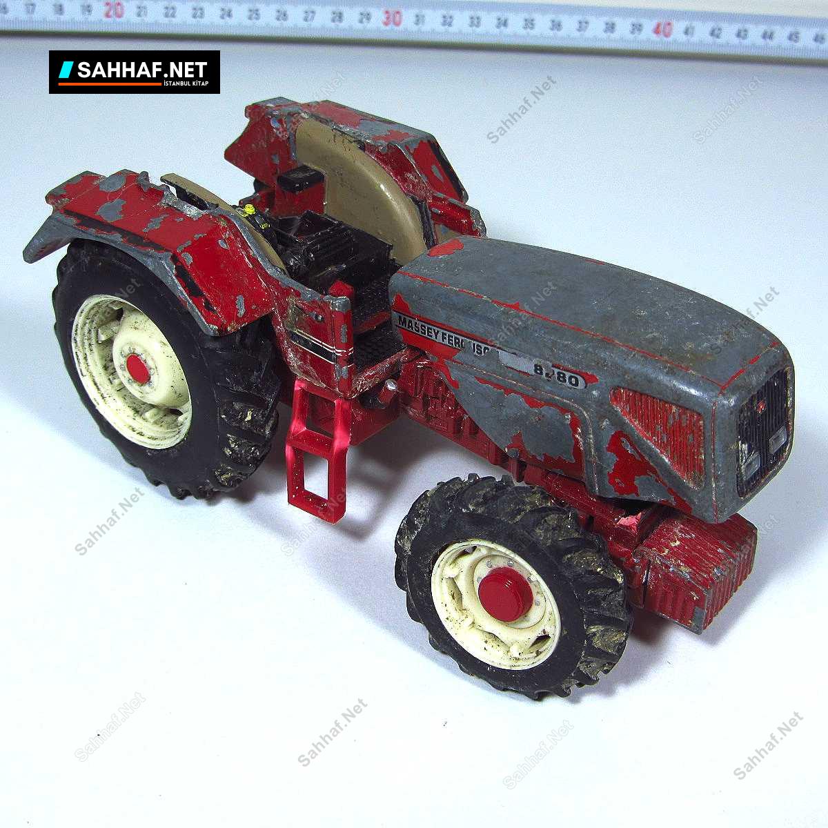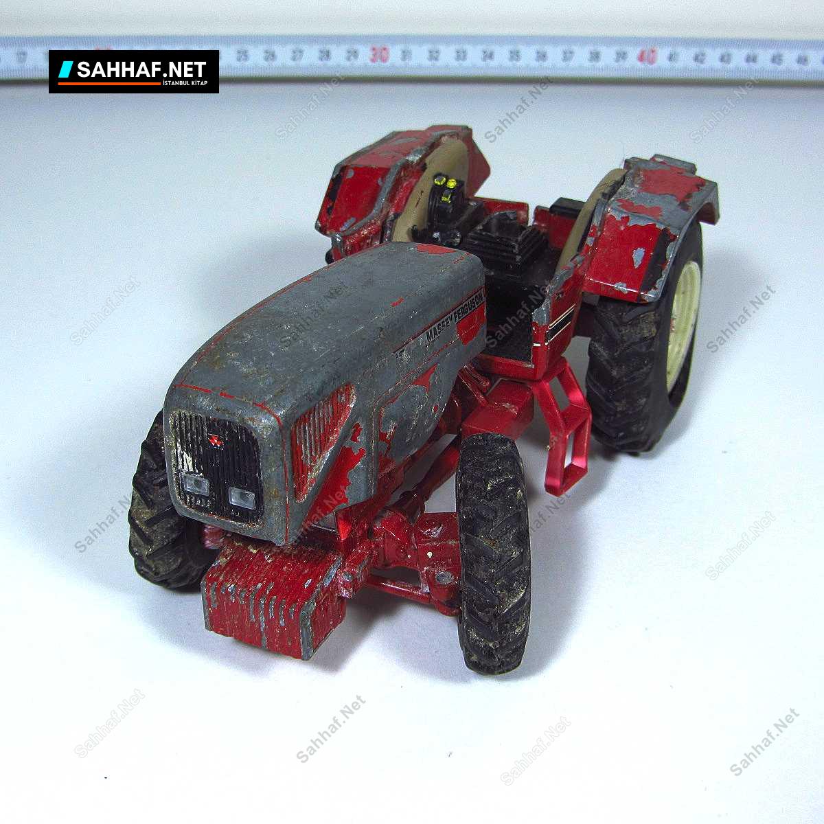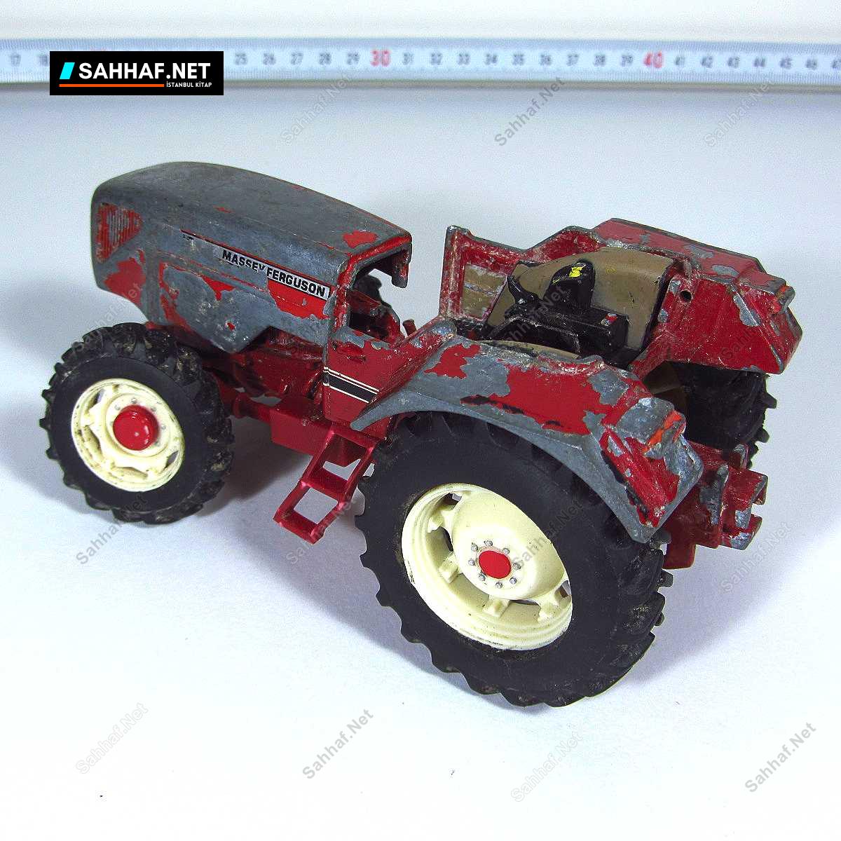Oyuncak Massey Ferguson traktör. Kırık ve eksikleri var haliyle, ön mil tekerlek bağlantısı yerinden çıkmış, motor kaputu hafif eğri duruyor, şoför mahallinde küçük bir parça kırığı var,, belki göremediğimiz başka kusurları da olabilir, fakat nadir bir parça; traktör dediğin zaten biraz hırpalanmış olur. Uzunluk: 15 cm