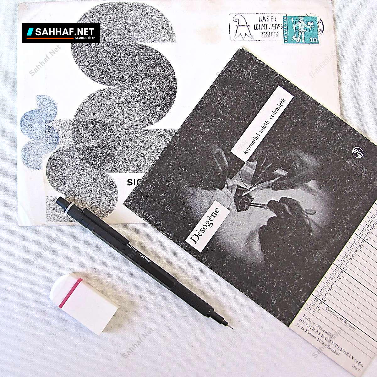 Geigy ilaç firması DESOGENE ilaç tanıtım broşürü (karton) ve zarfı. Broşürün üzerinde 1950 yılı takvimi var. Kart İsviçre’den gönderilmiş, üzerinde Basel damgası var. Türkçe.