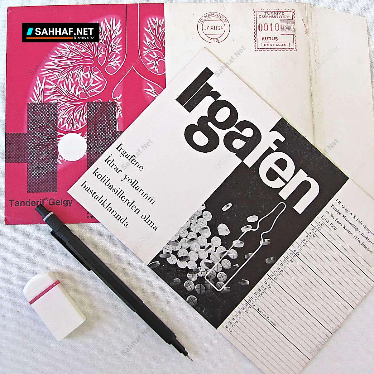 Geigy ilaç firması IRFAGEN ilaç tanıtım broşürü ve zarfı. 10 kuruş damgalı, 1950’lerden. Zarfın arka kısmında yırtık var, eksiği yok. Türkçe, Karton broşür.