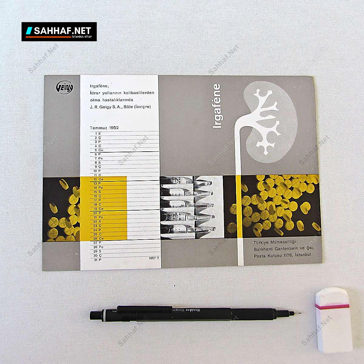 Geigy ilaç firması IRGAFENE ilaç tanıtım broşürü. Üzerinde 1952 yılı takvimi var.