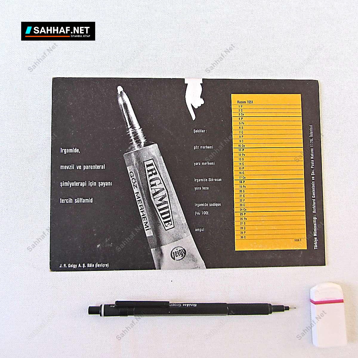 Geigy ilaç firması IRGAMIDE ilaç tanıtım broşürü. Üzerinde 1951 yılı takvimi var. Karton,1950’ler.