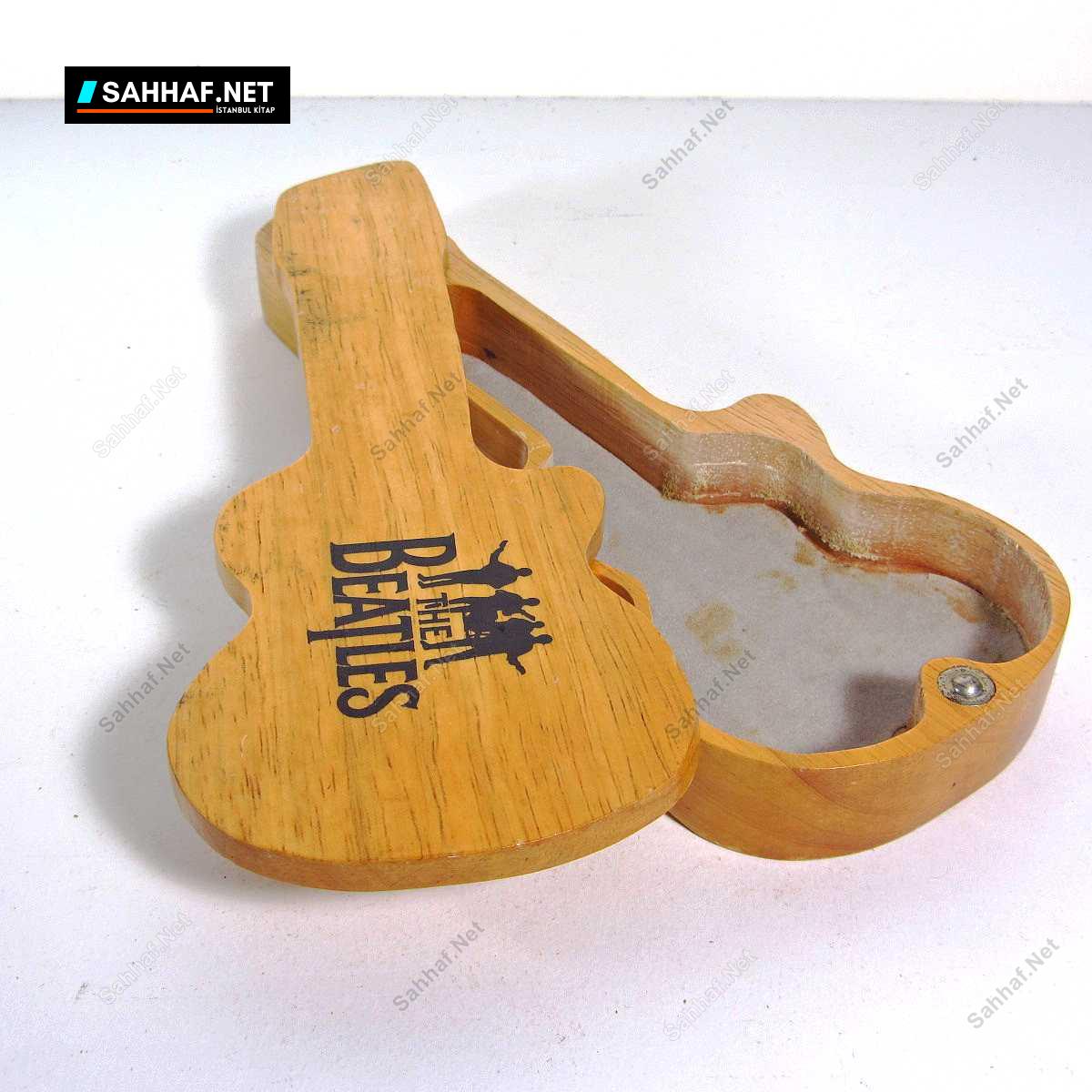 Üzerinde The Beatles müzik grubu baskısı olan bir ahşap kutu. Arkasında Apple şirketinin de logosu var, verniklenmiş ahşaptır.
