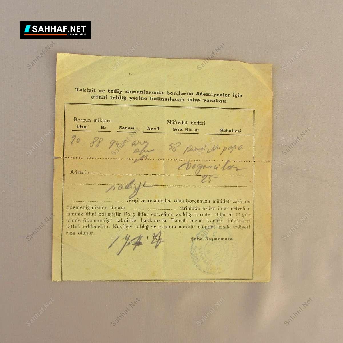 1943 yılına ait, taksit ve tediy zamanlarında borçlarını ödemiyenler için şifahi tebliğ yerine kullanılacak ihtar varakası. Orta kısmıdan ayrılabilir nitelikte ilginç bir evrak.