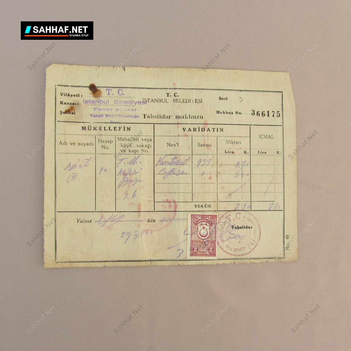 İSTANBUL BELEDİYESİ FENER ŞUBESİ TAHSİLDAR MAKBUZU