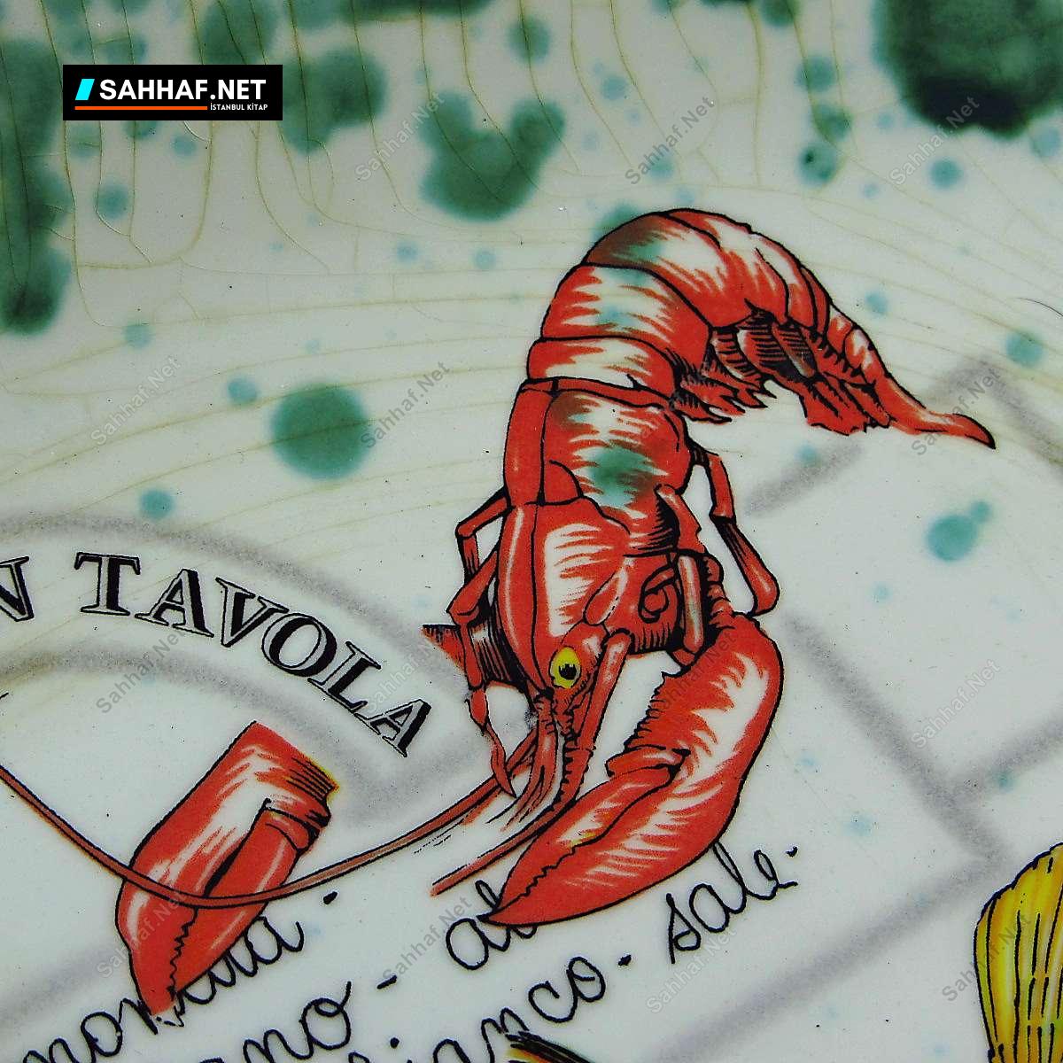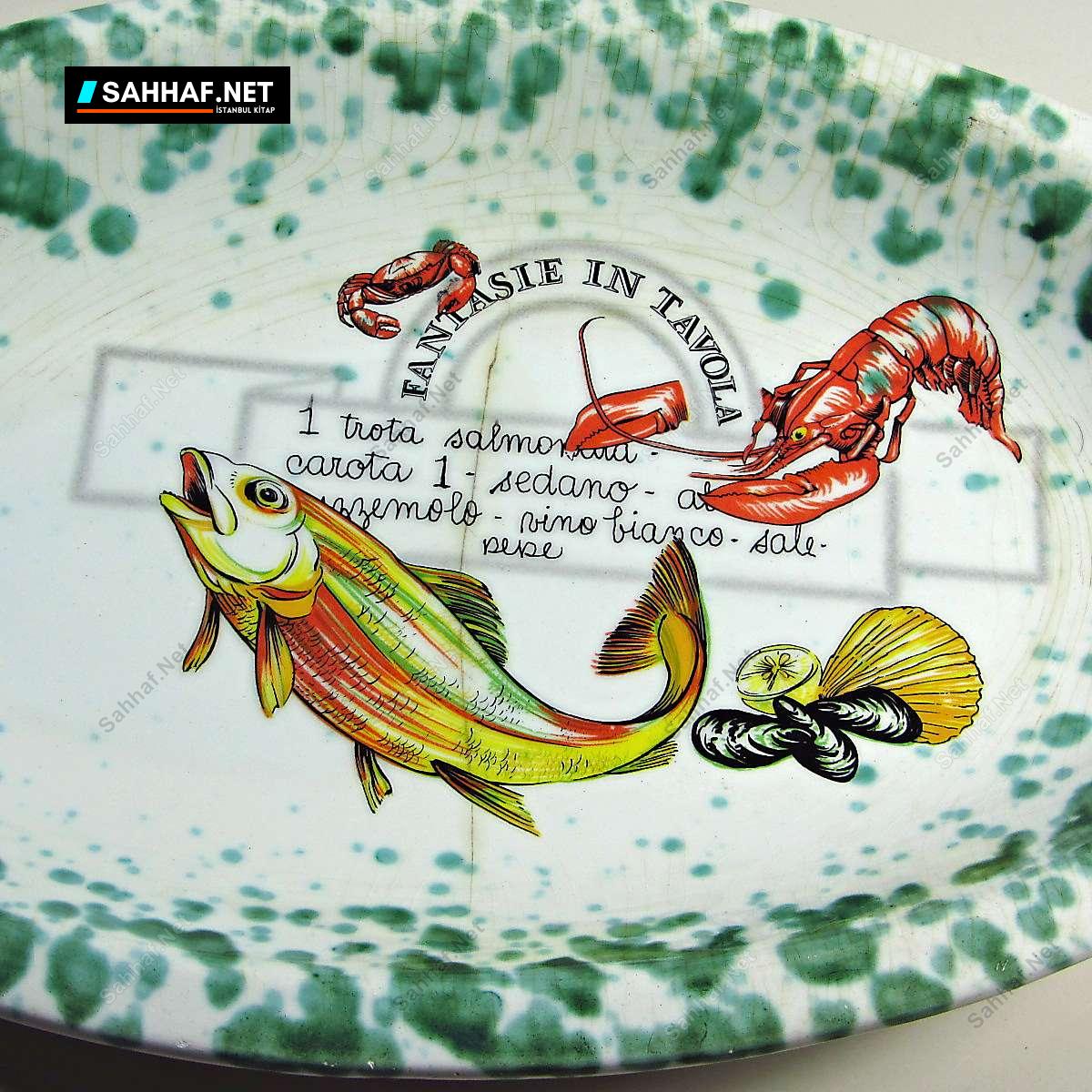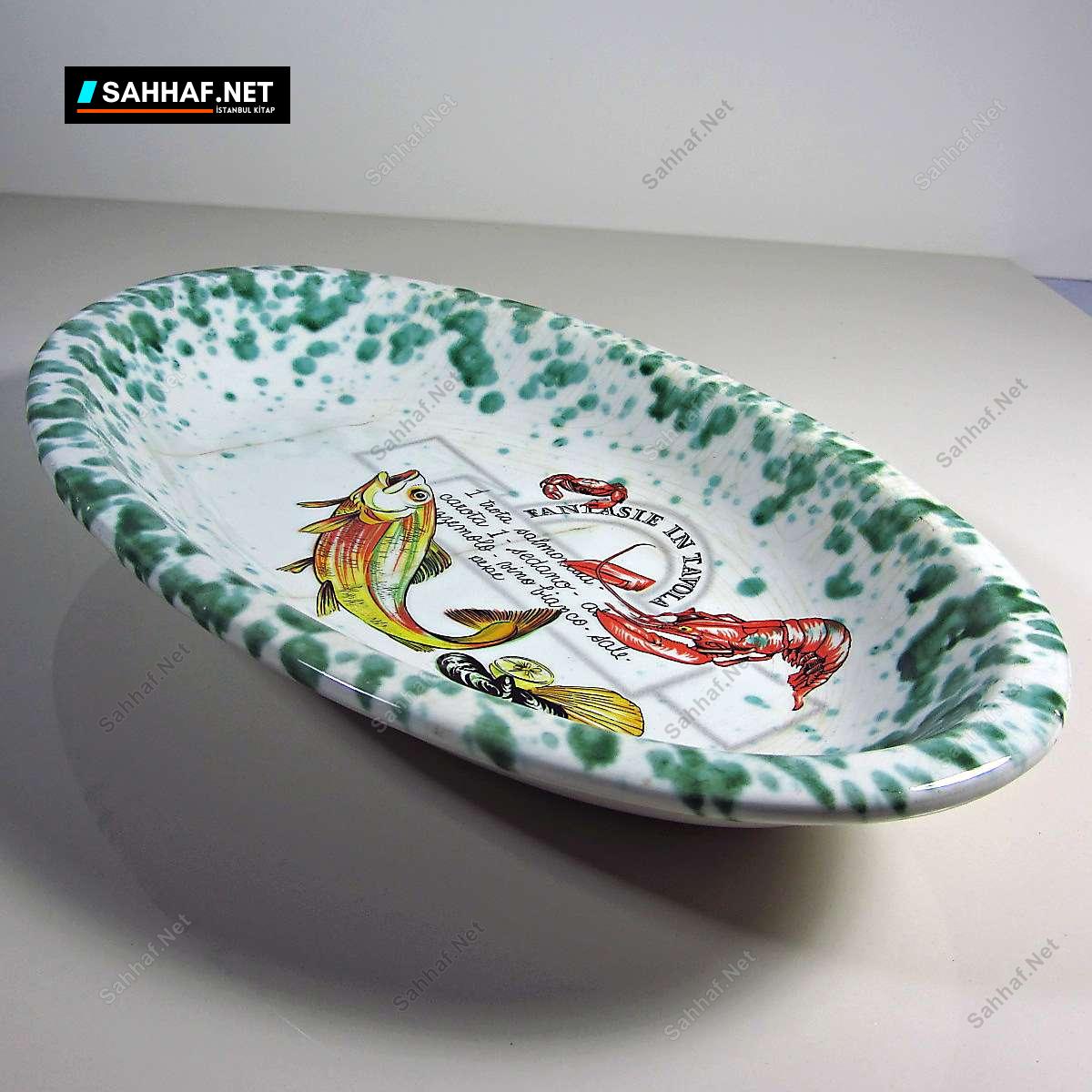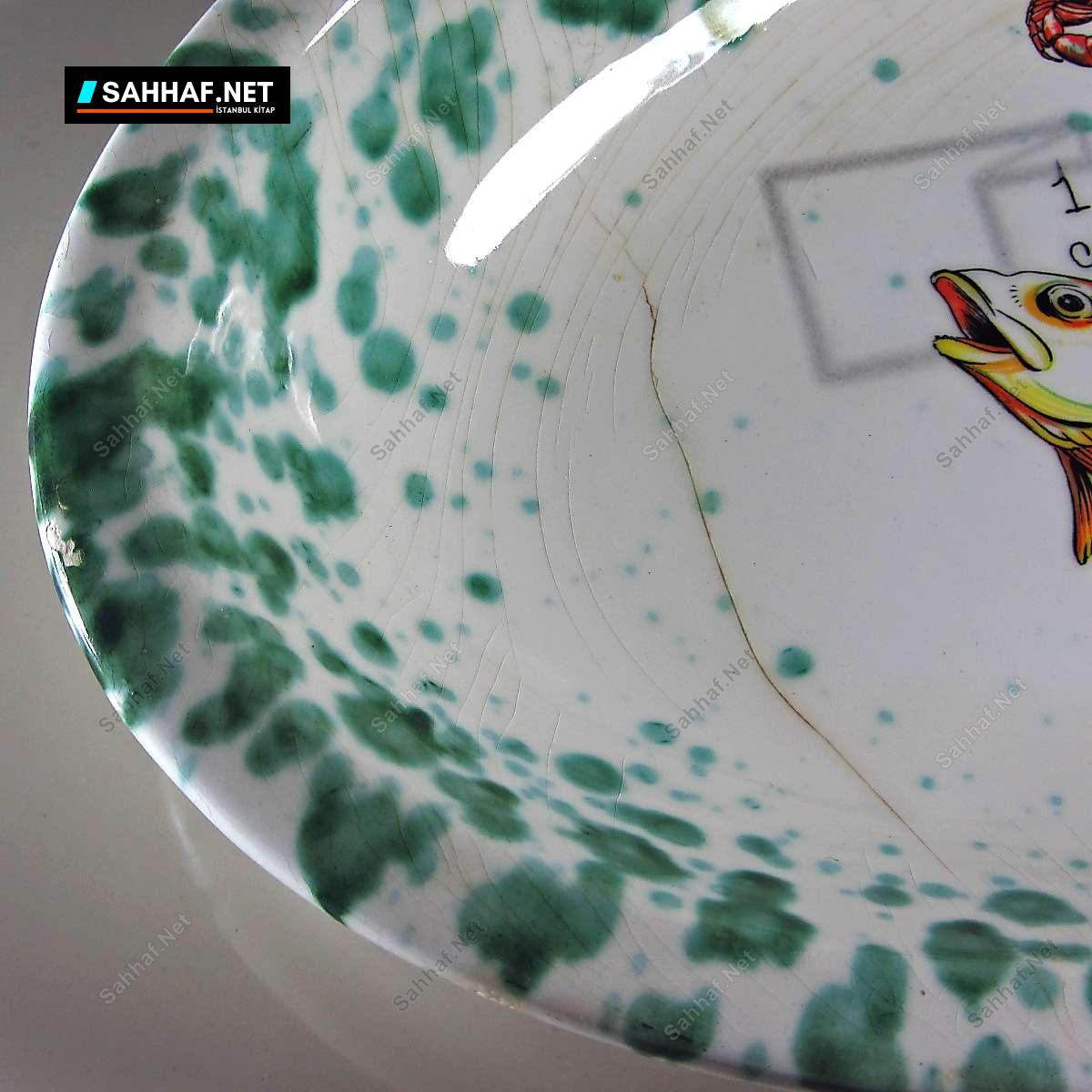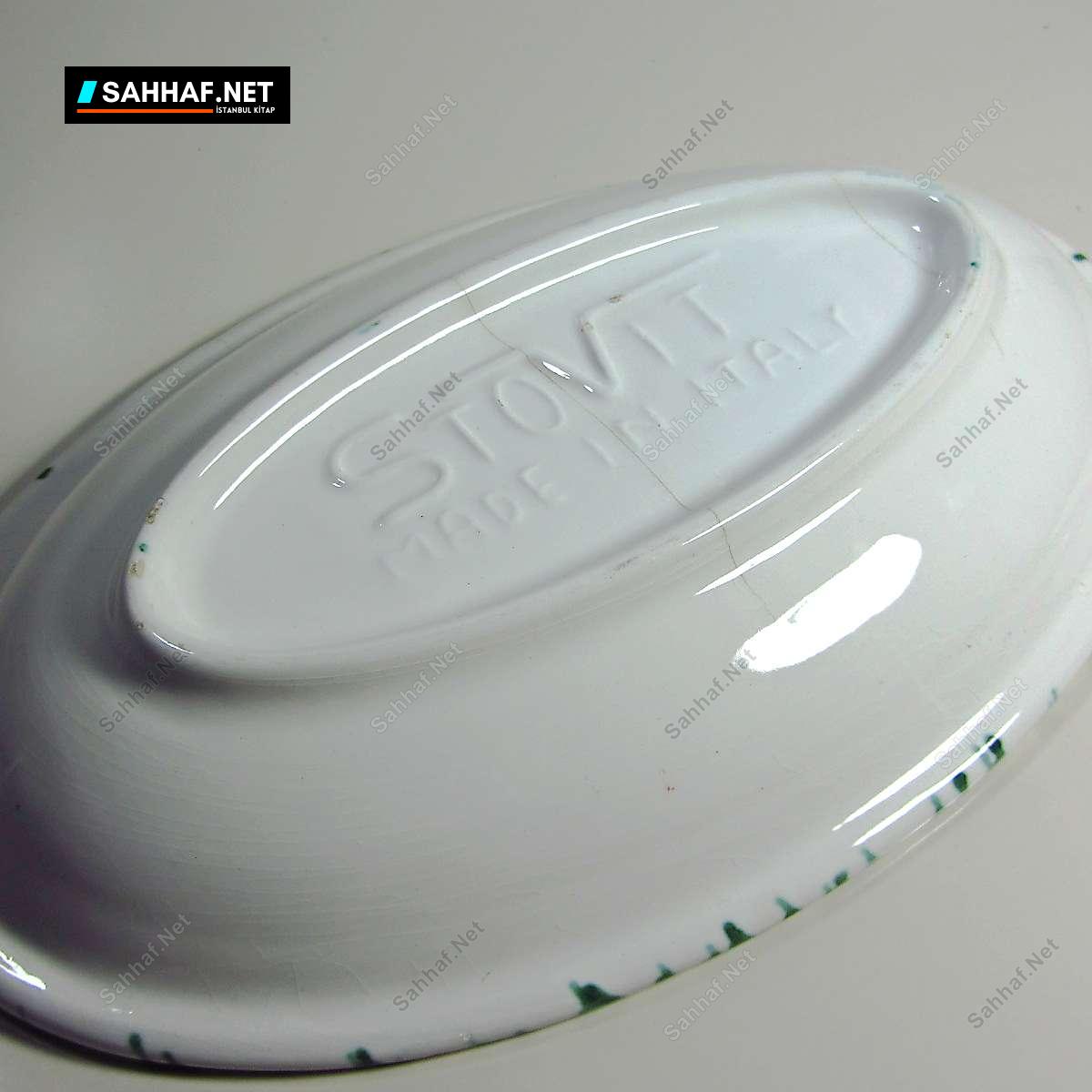 Porselen veya seramik, İtalyan STOVIT marka 1900’lerin ilk yarısından harika bir balık tabağı. İçindeki resim tablo gibi, özenle yapılmış bir ürün, kaplaması gayet düzgün. Yaşına göre doğal olsa da, maalesef sır çatlakları oluşmuş. Güzelliğini bozmuyor, zaten yaşını göstermesi adına da normal bir durum. Yalnızca sol kısmında 1 mm’lik minik bir değme izi var. Sıradışı ve görselliği yüksek bir ürün, her zaman insanın karşısına çıkacak bir ürün değil. Geniş kısmı 28 cm