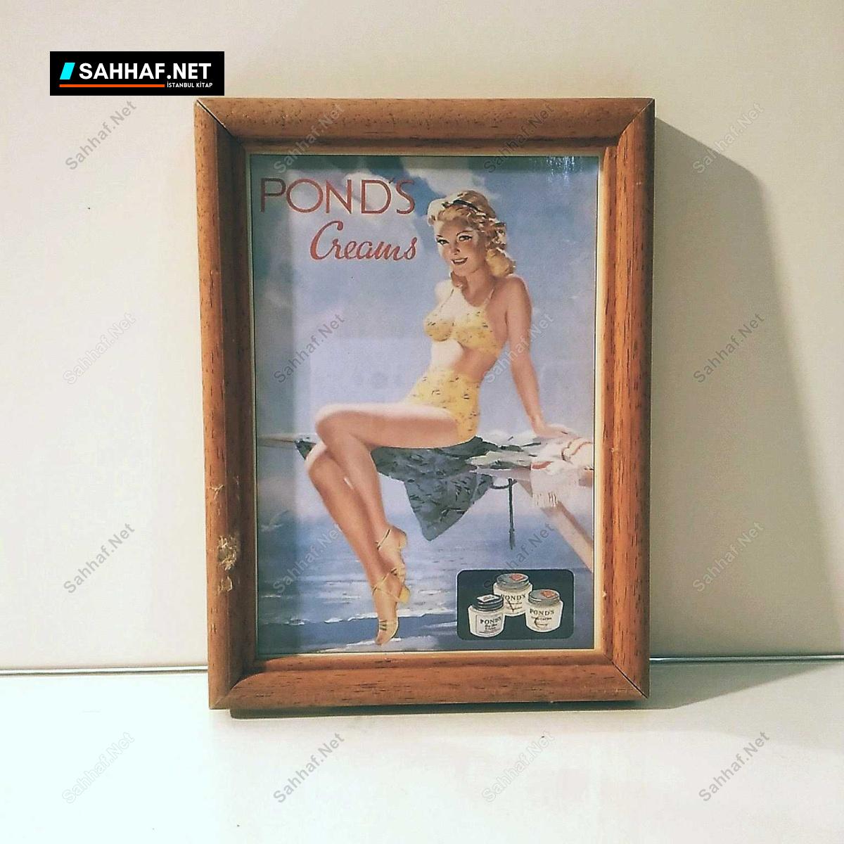 Pond’s Creams reklamlı ahşap çerçeveli güzel bir resim. Arkasında Made in Italy mührü var. Çok ince bir cam kullanılmış, sanki cam yokmuş gibi. Çerçevenin sol tarafında küçük bir atık var. Ebat: 12×16 cm
