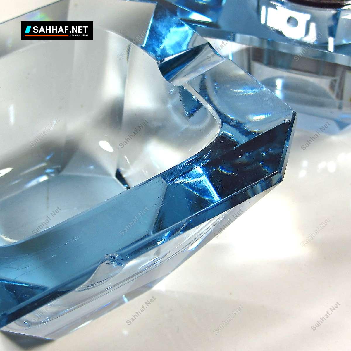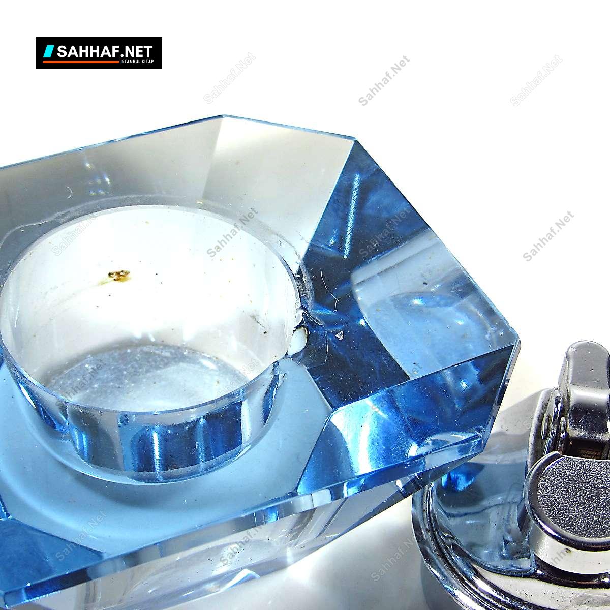 Olağanüstü güzellikte saf kristalden yapılmış çok tatlı mavi tonda çakmak ve kül tabağı. Kullanmadığınız zamanlarda küllük çakmağın üzerinde örtülerek kapatılabiliyor. Kendinden renkli kristaldir, herhangi bir boya söz konusu değildir. Küllük ve çakmağın oturduğu kısımda nazarlık niyetine küçük birer atık mevcut, onun dışında pırıl pırıl (resimlerde yakın planda gösterdik, her biri yarım santim kadar) Çakmak bölümünde olan alt kısmı zaten çakmak örtüyor. Genişlik: 9,5 cm
