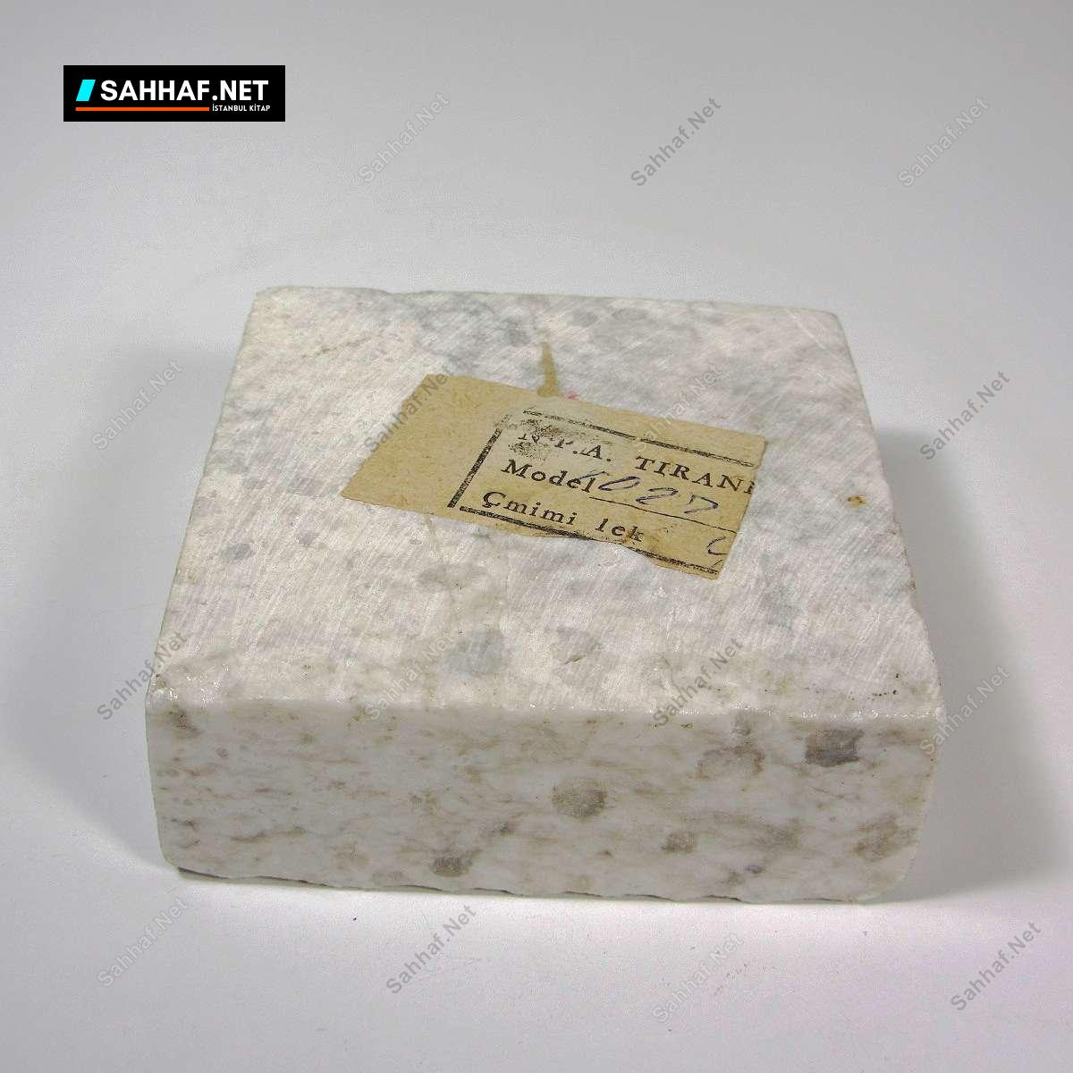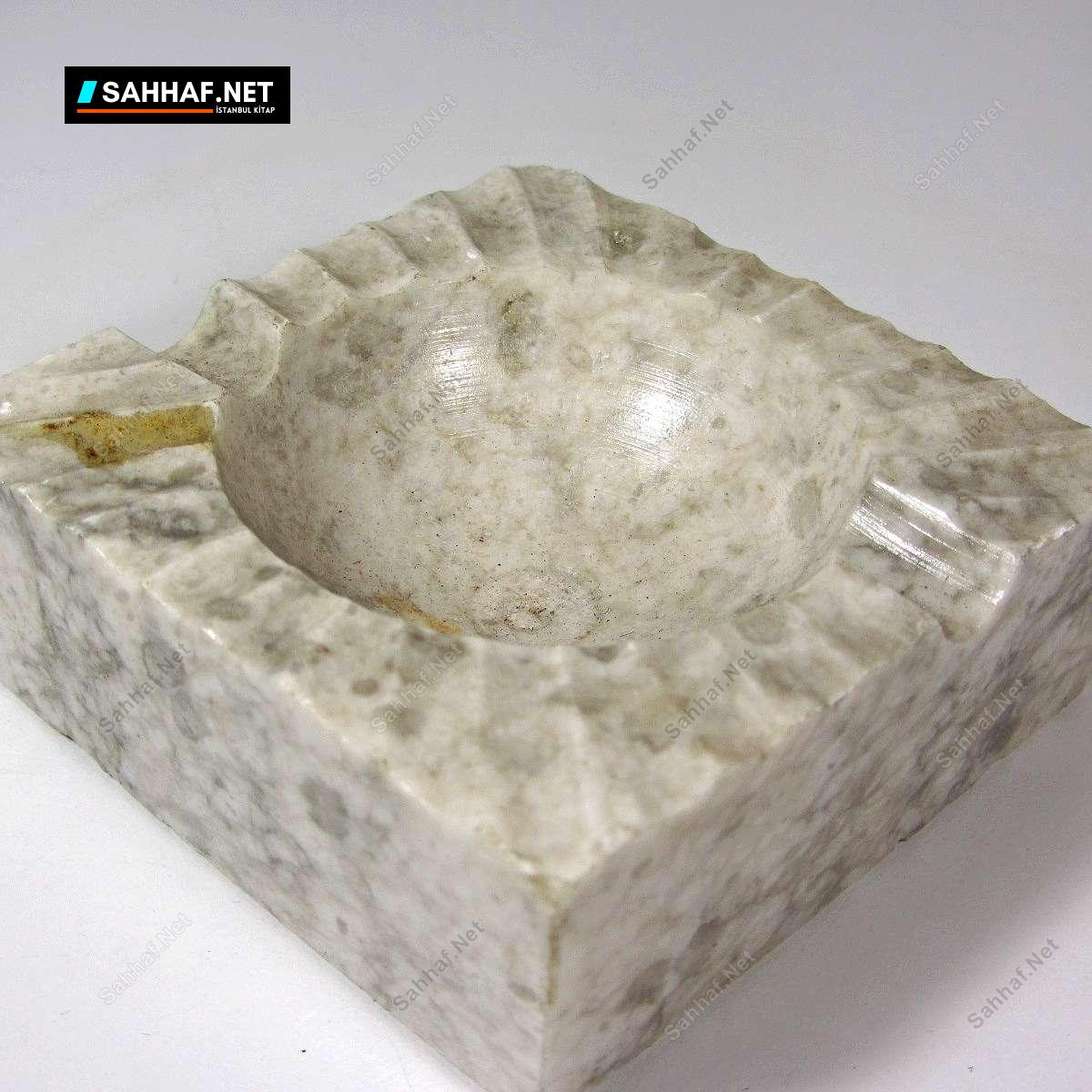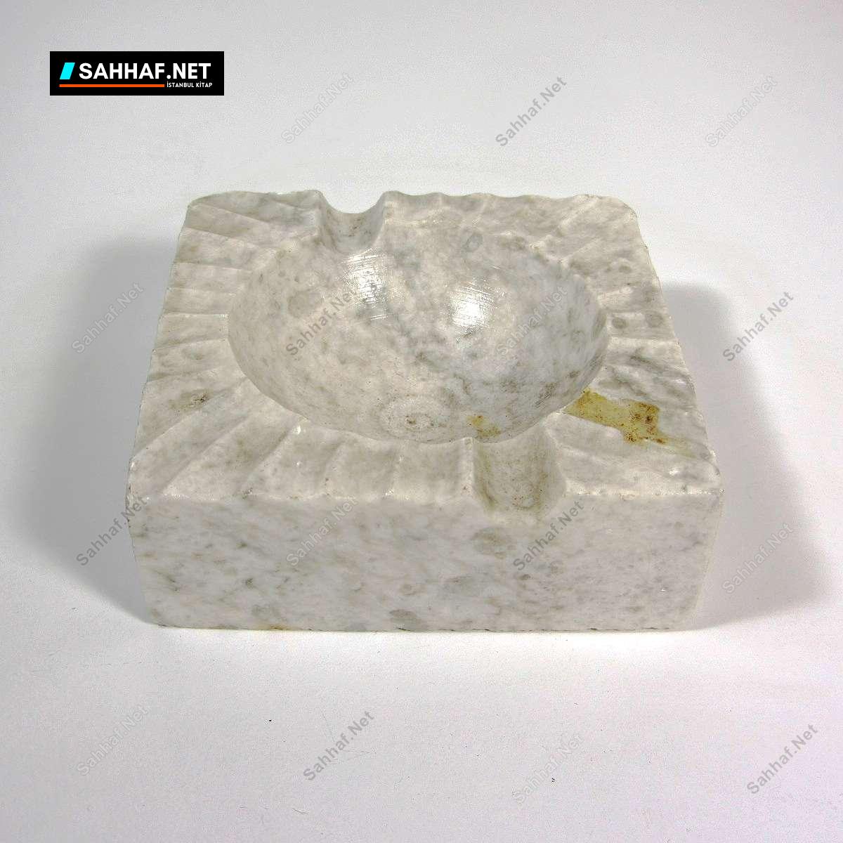 Küçük boy mermer kül tabağı. Üst kısmında birbirini takip eden yivler açılarak güzel bir efekt elde edilmiş. Üzeri vernik kaplamadır, üst kısımda görülen leke muhtemelen silinince çıkar; vernik kaplamayı sökebilir endişesiyle dokunmadık. Zengin bir duruşu var, küçük olmasına rağmen oturaklı duruyor. Altındaki kağıt etiketi hala duruyor, sanırım hiç kullanılmamış. Genişlik: 7,5 cm