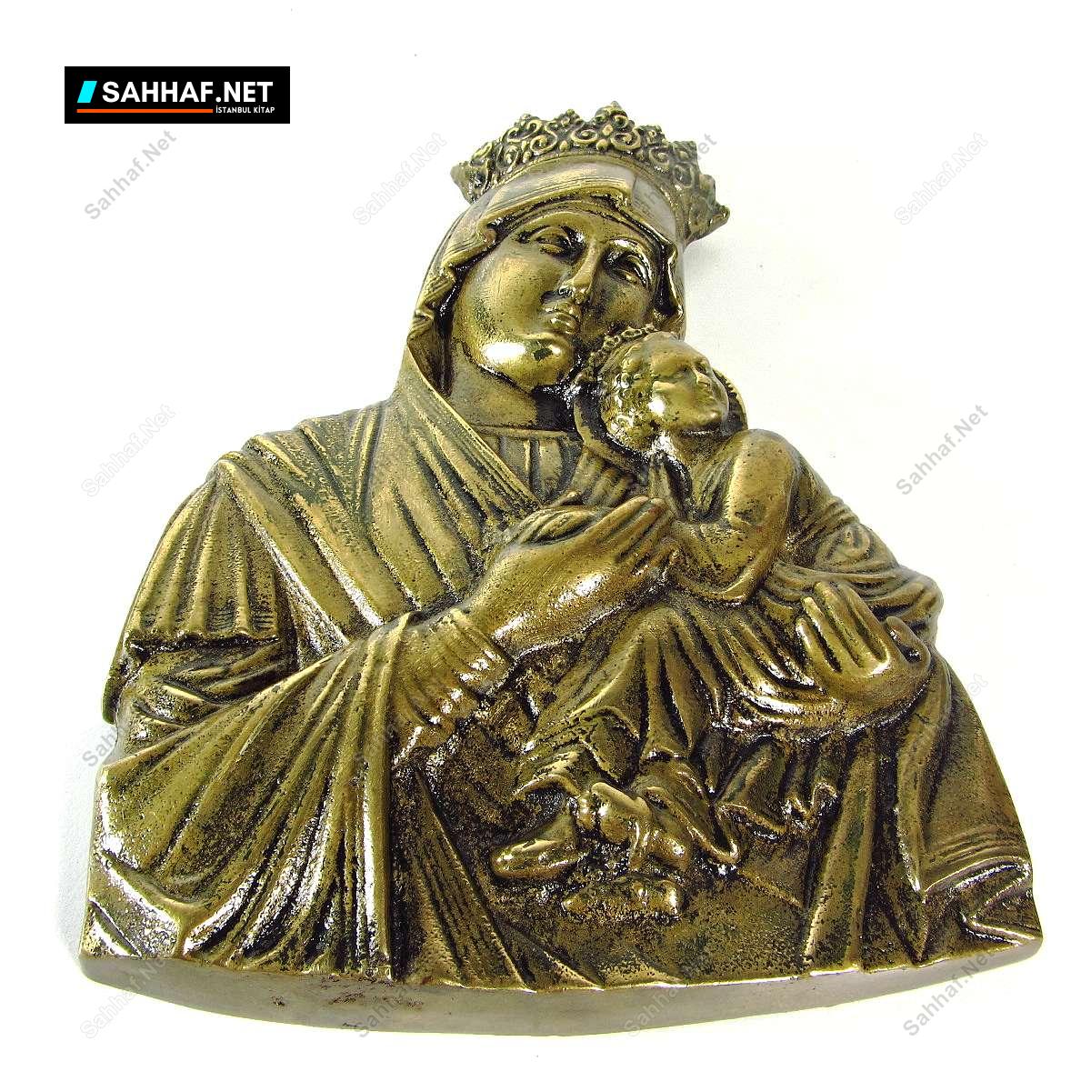 Hıristiyanlık temalı çok güzel bir pirinç obje, Meryem ve İsa figürü. Gayet özenli yapılmış bir çalışma; ağır ve eski bir malzemedir. Arka kısmında asma aparatı da mevcut. Yükseklik: 16 cm