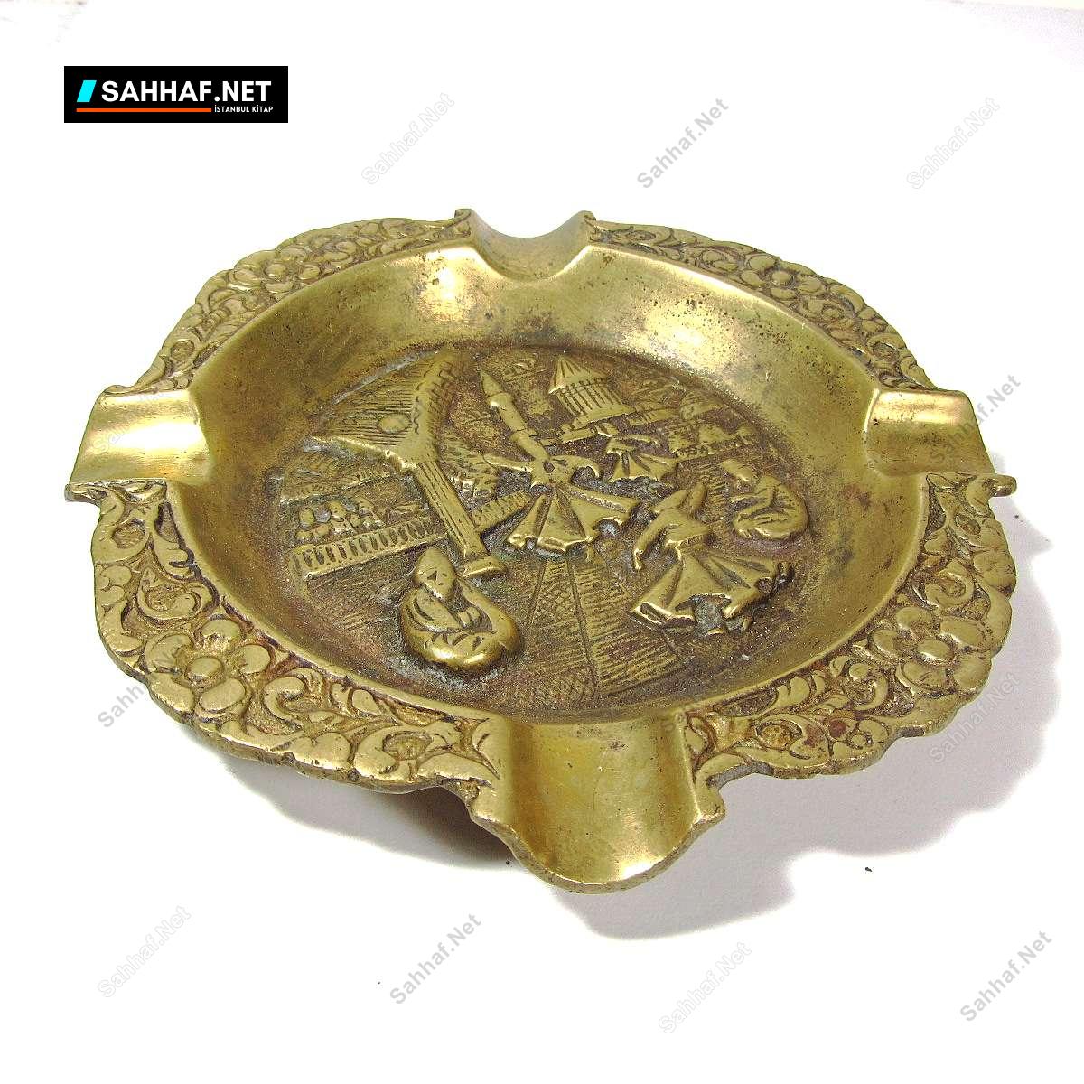 Konya temalı, mevlevi figürlü eskilerden güzel bir kül tabağı. Oldukça ağır, sanırım yarım kilo kadar var. Yuvarlakla kare arasında bir şekle sahip. Çap: 14,5 cm