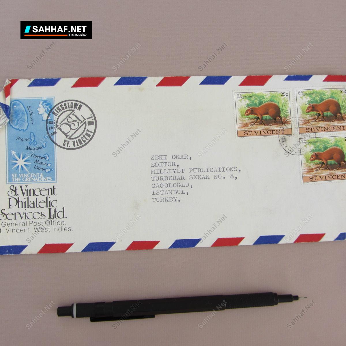 Zeki Okar adnına Milliyet gazetesine gönderilmiş yabancı mektup zarfı. Pullar 1980 yılına ait, zarfın üzerinde yıl damgası göremedim.