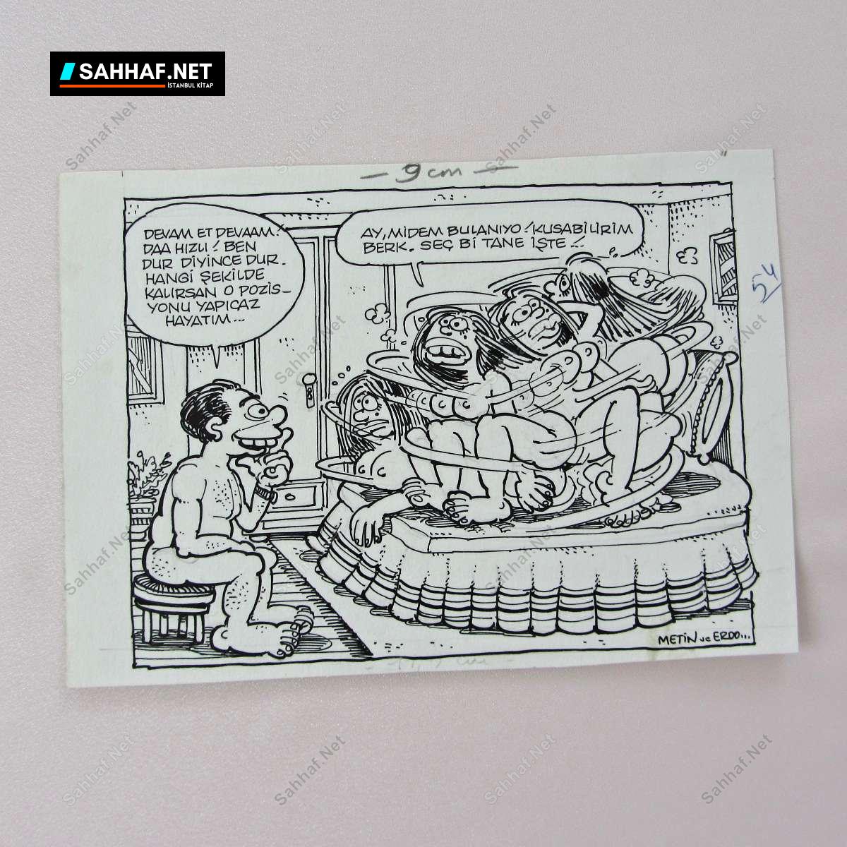 Ay, midem bulanıyo! Kusabilirim Berk. Seç bi tane işte. Karton üzerine çini mürekkebi, dergide yayınlanmış, el çizimi orijinal karikatür. 1980 sonları veya 1990 başları. (Belirtilen ebatlar karikatürün net ölçüsüdür)