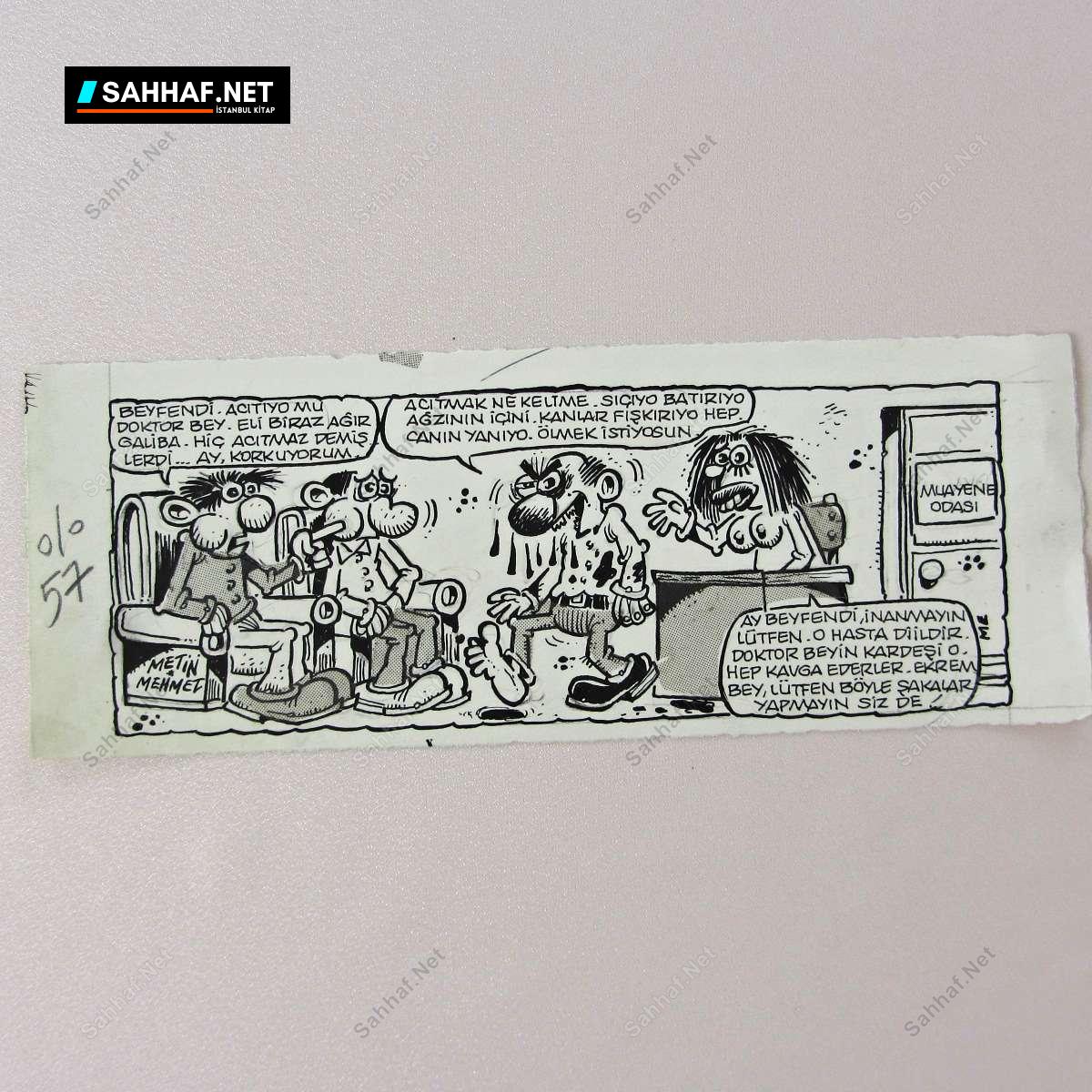 Beyefendi. Acıtıyo mu doktor bey? Eli biraz ağır galiba. Hiç acıtmaz demişlerdi… Ay, korkuyorum.. Karton üzerine çini mürekkebi, dergide yayınlanmış, el çizimi orijinal karikatür. 1980 sonları veya 1990 başları. (Belirtilen ebatlar karikatürün net ölçüsüdür)