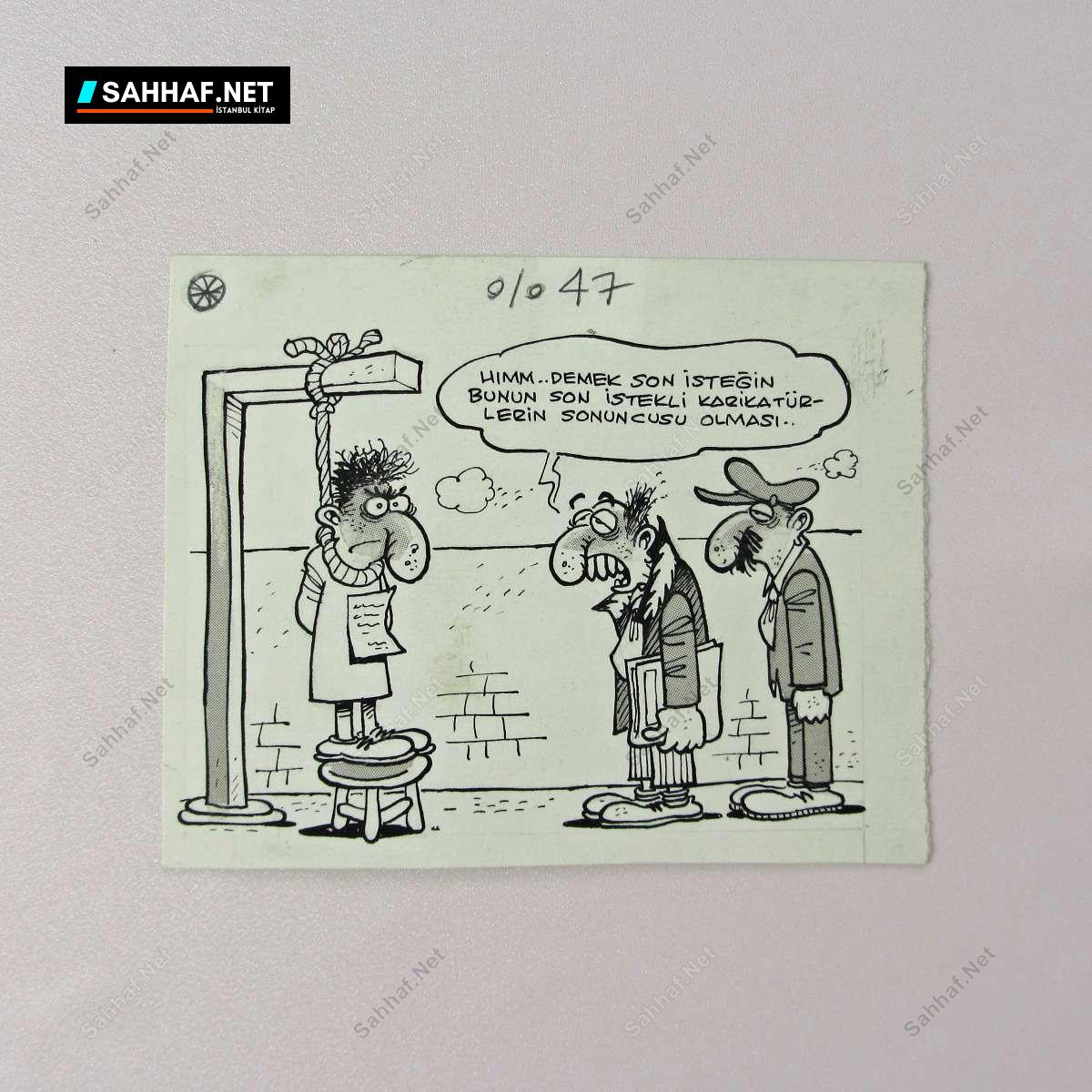 Hımm. Demek son isteğin bunun son istekli karikatürlerin sonuncusu olması. Karton üzerine çini mürekkebi, dergide yayınlanmış, el çizimi orijinal karikatür. 1980 sonları veya 1990 başları. (Belirtilen ebatlar karikatürün net ölçüsüdür)