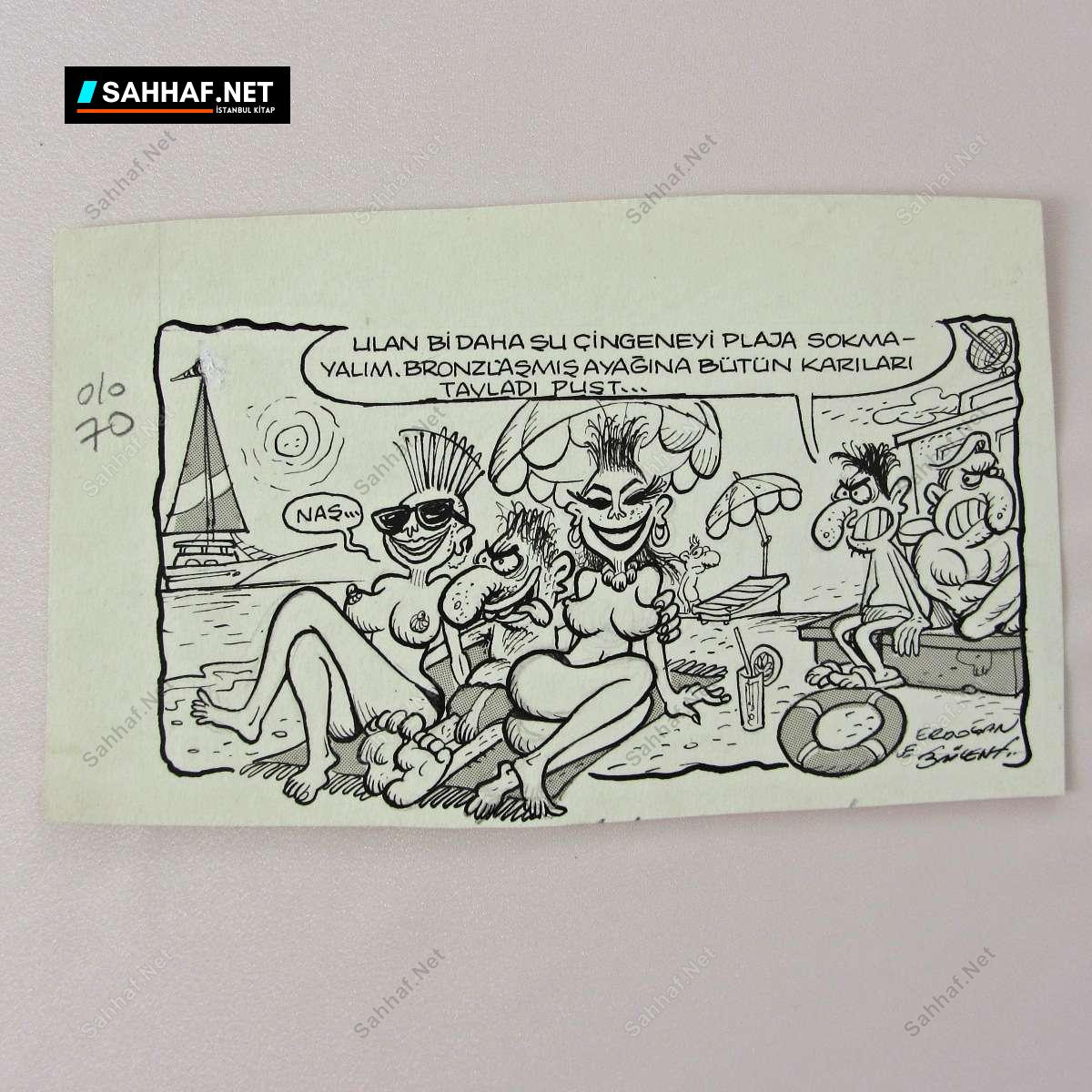 Ulan bi daha şu çingeneyi plaja sokmayalım. Bronzlaşmış ayağına bütün karıları tavladı puşt… Karton üzerine çini mürekkebi, dergide yayınlanmış, el çizimi orijinal karikatür. 1980 sonları veya 1990 başları. (Belirtilen ebatlar karikatürün net ölçüsüdür)