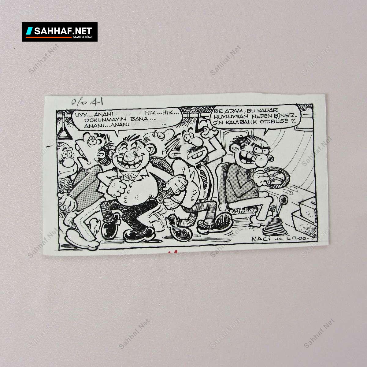 Uyy… Ananı! Hık… Hık… Dokunmayın bana… Ananı… Ananı.. Karton üzerine çini mürekkebi, dergide yayınlanmış, el çizimi orijinal karikatür. 1980 sonları veya 1990 başları. (Belirtilen ebatlar karikatürün net ölçüsüdür)