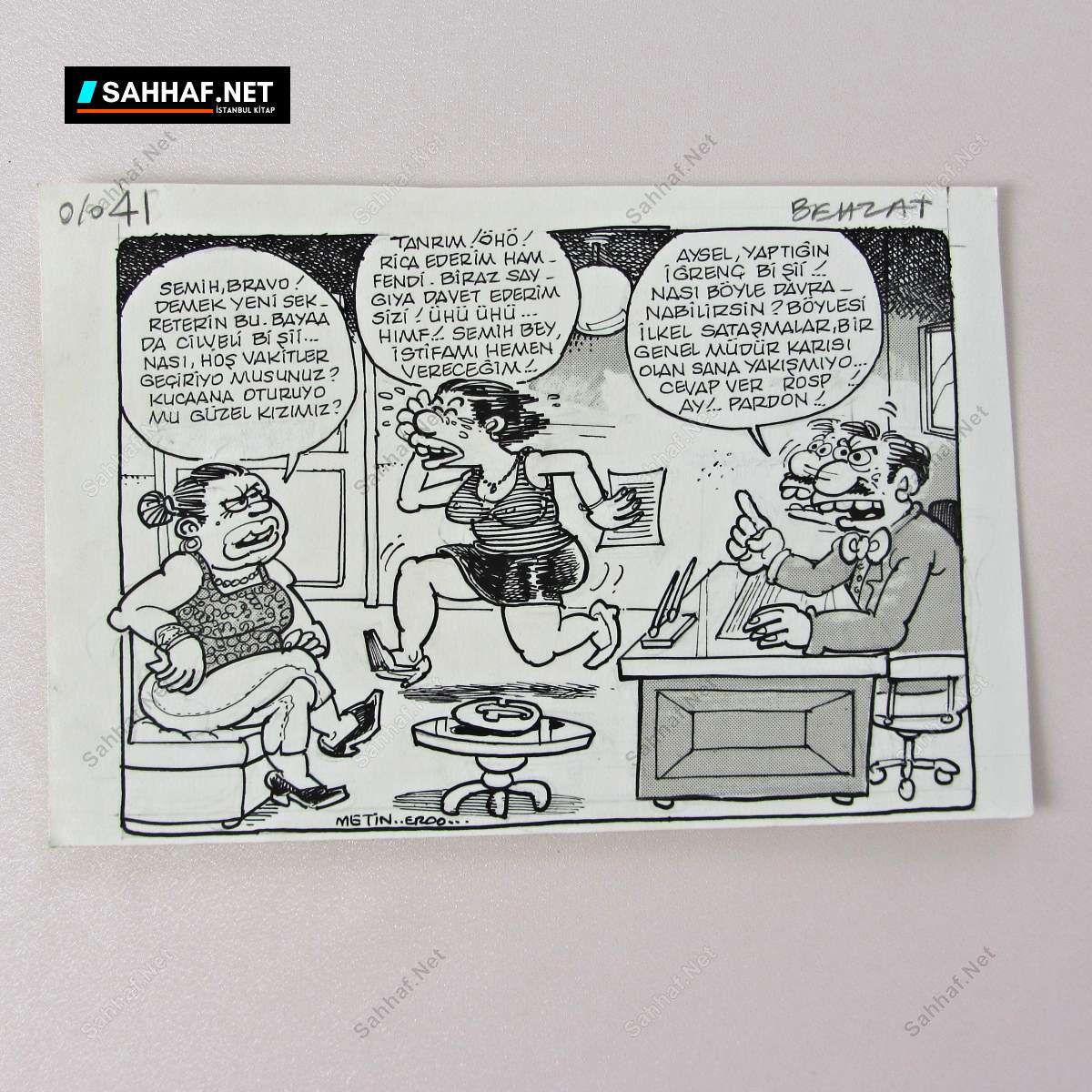 Semih, bravo!. Demek yeni sekreterin bu. Bayaa da cilveli bi şii… Nası, hoş vakitler geçiriyo musunuz? Kucaana oturuyo mu güzel kızımız? Karton üzerine çini mürekkebi, dergide yayınlanmış, el çizimi orijinal karikatür. 1980 sonları veya 1990 başları. (Belirtilen ebatlar karikatürün net ölçüsüdür)