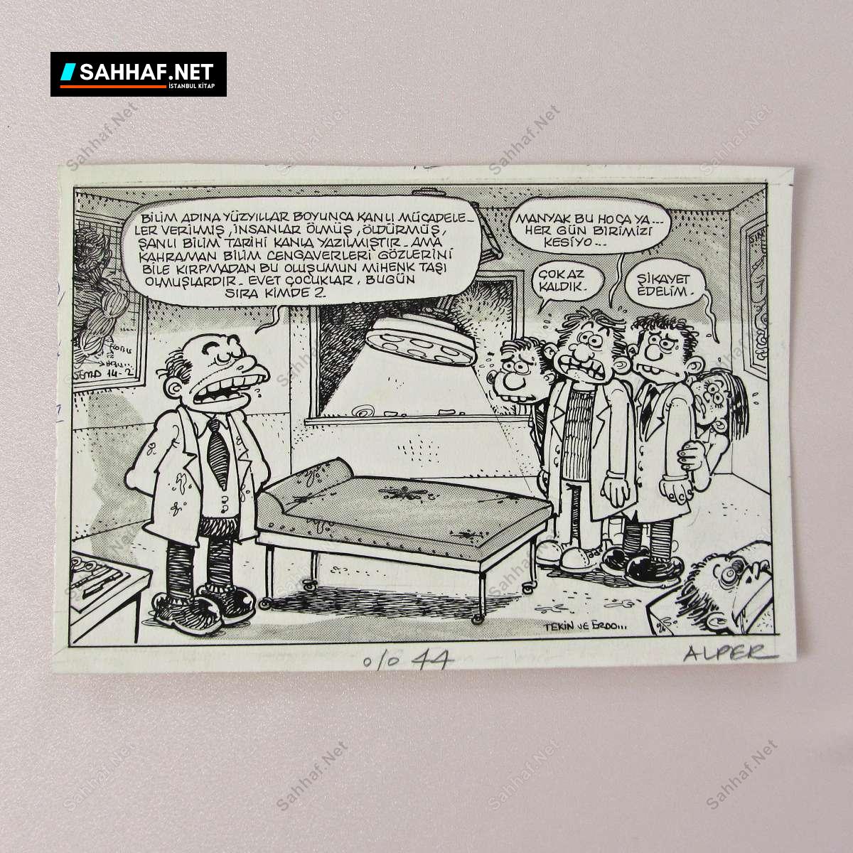 Manyak bu hoca ya… Her gün birimizi kesiyo… Karton üzerine çini mürekkebi, dergide yayınlanmış, el çizimi orijinal karikatür. 1980 sonları veya 1990 başları. (Belirtilen ebatlar karikatürün net ölçüsüdür)