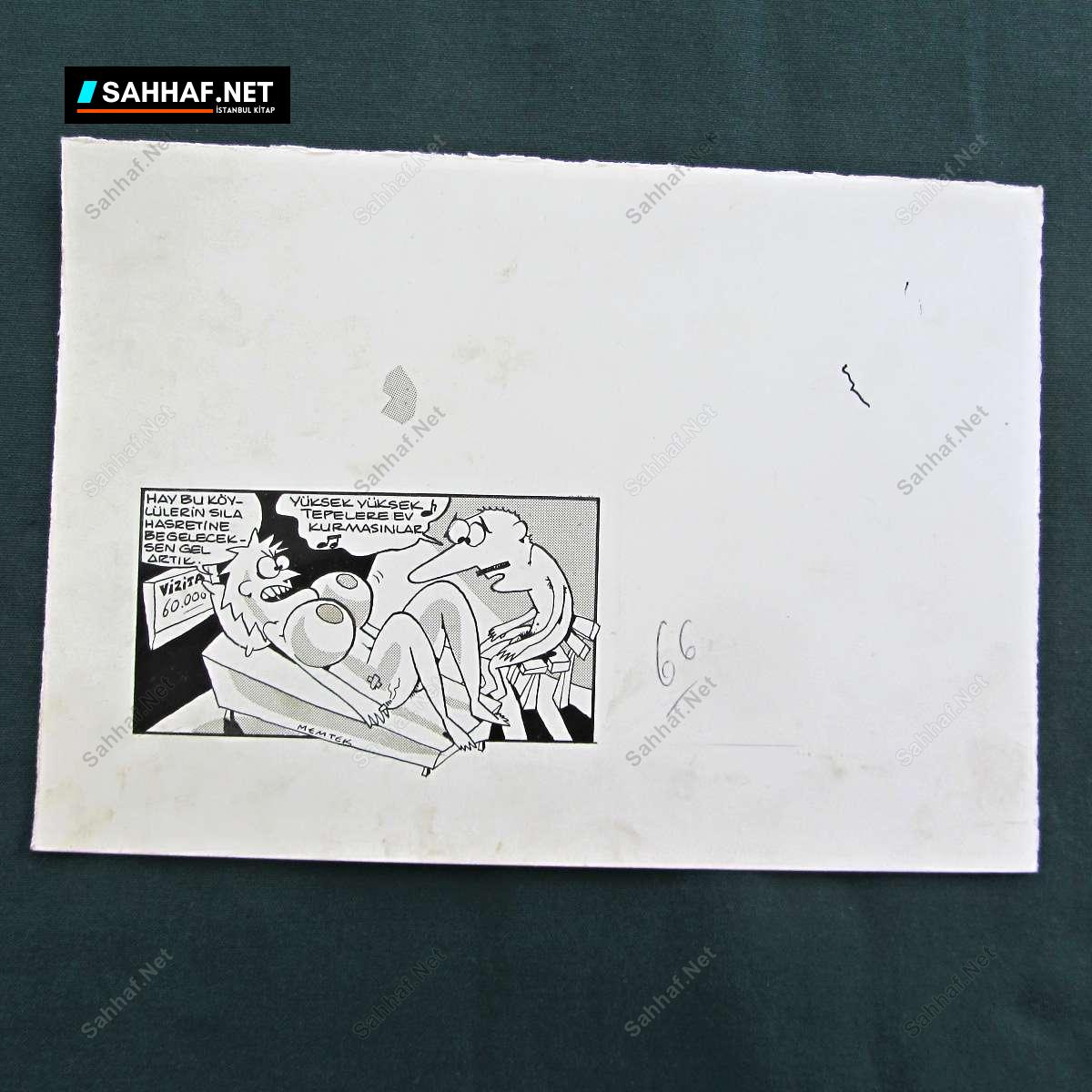 Hay bu köylülerin sıla hasretine be, geleceksen gel artık. Karton üzerine çini mürekkebi, dergide yayınlanmış, el çizimi orijinal karikatür. 1980 sonları veya 1990 başları. (Belirtilen ebatlar karikatürün net ölçüsüdür)