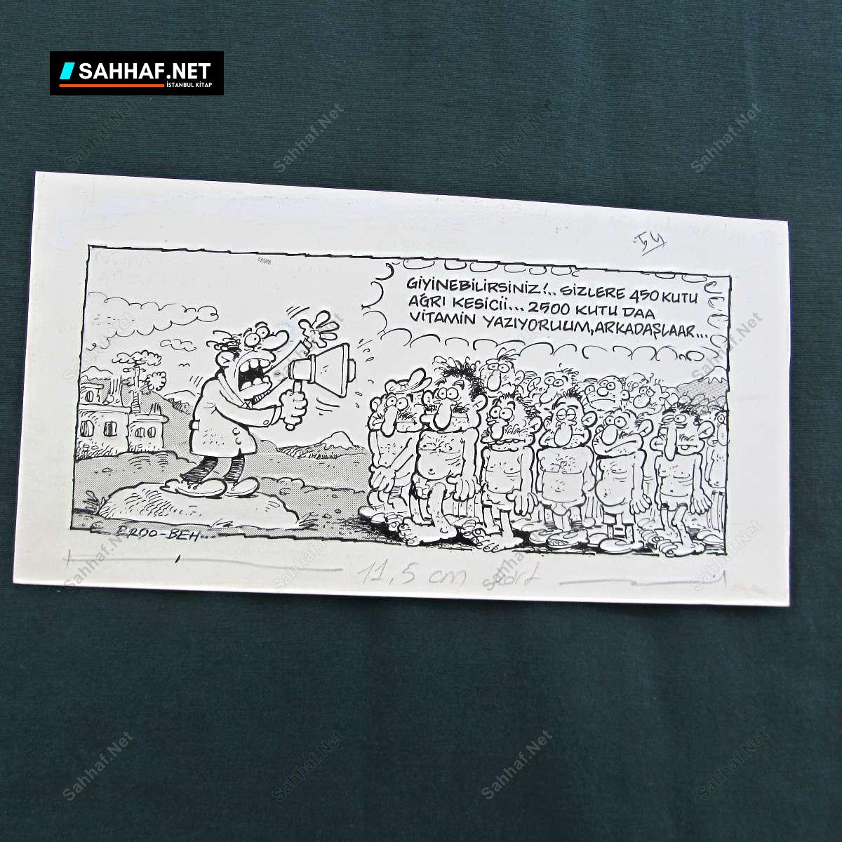 Giyinebilirsiniz!.. Sizlere 450 kutu ağrı kesicii… 2500 kutu daa vitamin yazıyoruum arkadaşlaar… Karton üzerine çini mürekkebi, dergide yayınlanmış, el çizimi orijinal karikatür. 1980 sonları veya 1990 başları. (Belirtilen ebatlar karikatürün net ölçüsüdür)