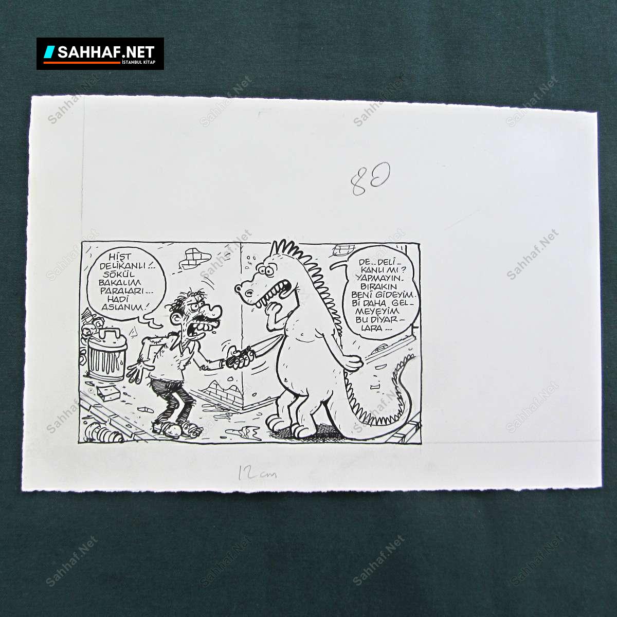 Hişt! Delikanlı!.. Sökül bakalım paraları.. Hadi aslanım! Karton üzerine çini mürekkebi, dergide yayınlanmış, el çizimi orijinal karikatür. 1980 sonları veya 1990 başları. (Belirtilen ebatlar karikatürün net ölçüsüdür)