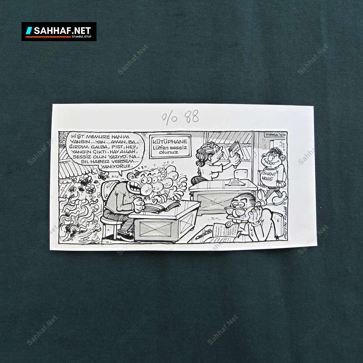 Hişt memure hanım yangın… Yan… Aman bağırdım galba. Pıst, hey, yangın çıktı. Hay Allah, sessiz olun yazıyo. Nasıl haber versem… Yanıyoruz. Karton üzerine çini mürekkebi, dergide yayınlanmış, el çizimi orijinal karikatür. 1980 sonları veya 1990 başları. (Belirtilen ebatlar karikatürün net ölçüsüdür)