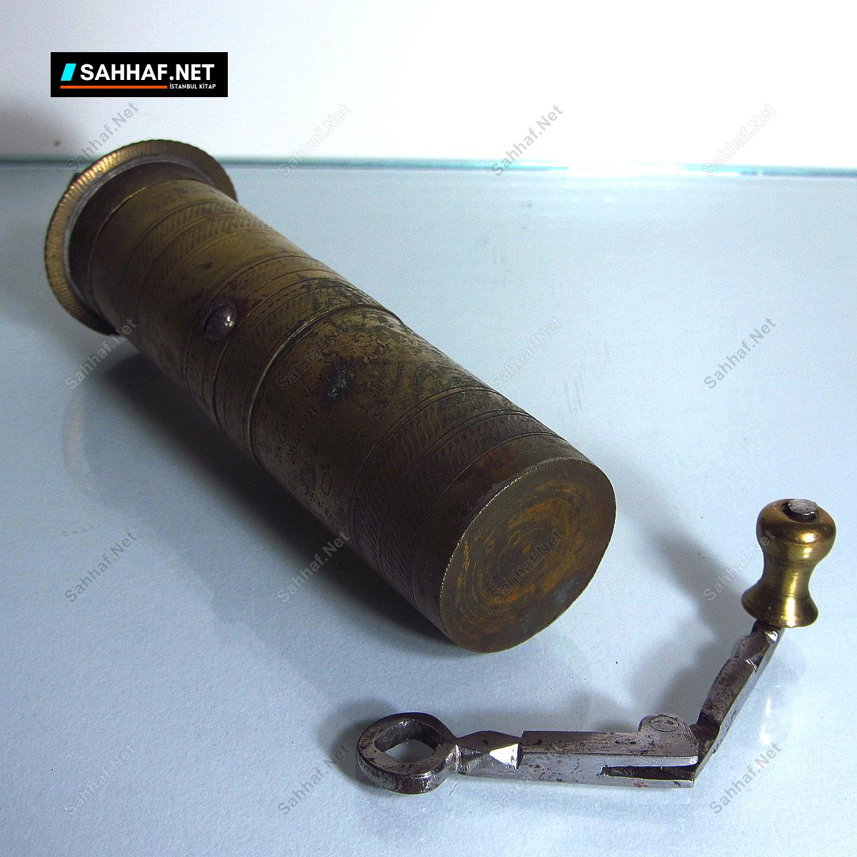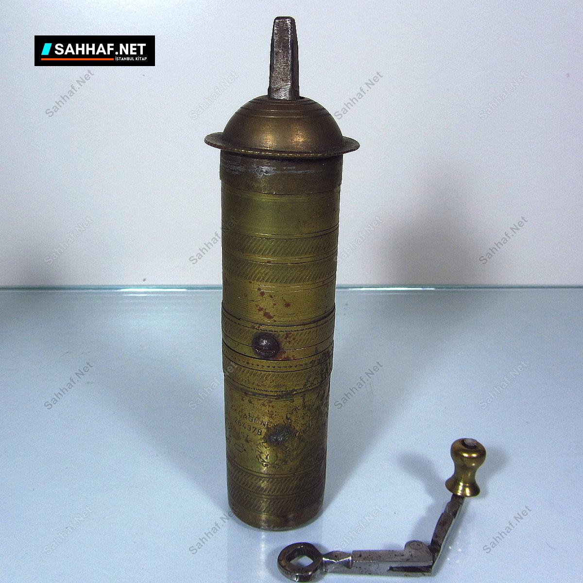 Üzeri Halil akçagüney İstanbul damgalı orta boy pirinç, yerli sanayi kahve değirmeni. Üzerindeki telefon numarası 6 haneli, çevirme kolu kendi orijinali, neredeyse her kahve değirmeninin başına gelen kuruyemiş kırma badiresi atlatmış. Alt kısmında ezik var fakat ağır bir hasarı yok. Yükseklik: 15 cm. Bu boy çıkmaz.