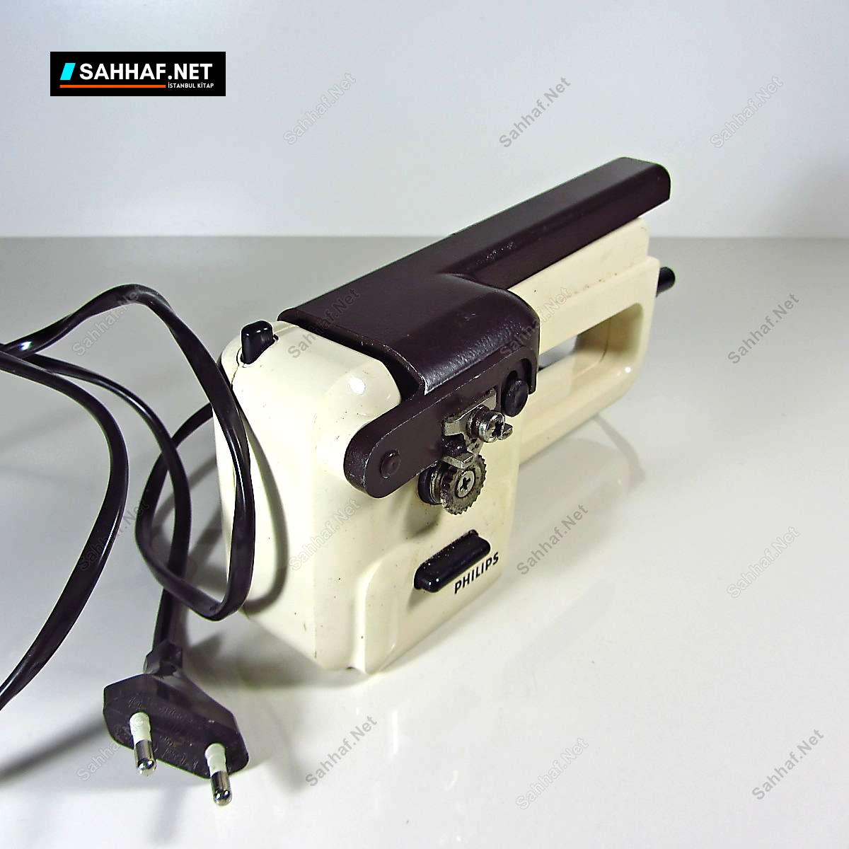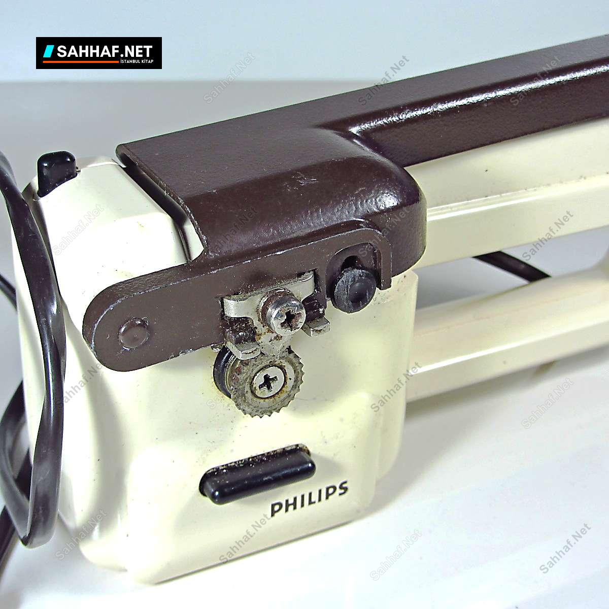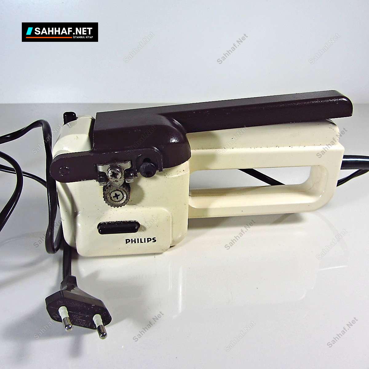 Philips marka elektrikli konserve açma makinası. Çalışır durumda ve son derece nadir bir ürün. Mutfak kültürü açısından önemli bir koleksiyon parçası. Üstteki kahverengi kısmı bastırınca hareket etmeye başlıyor. Boy: 19 cm